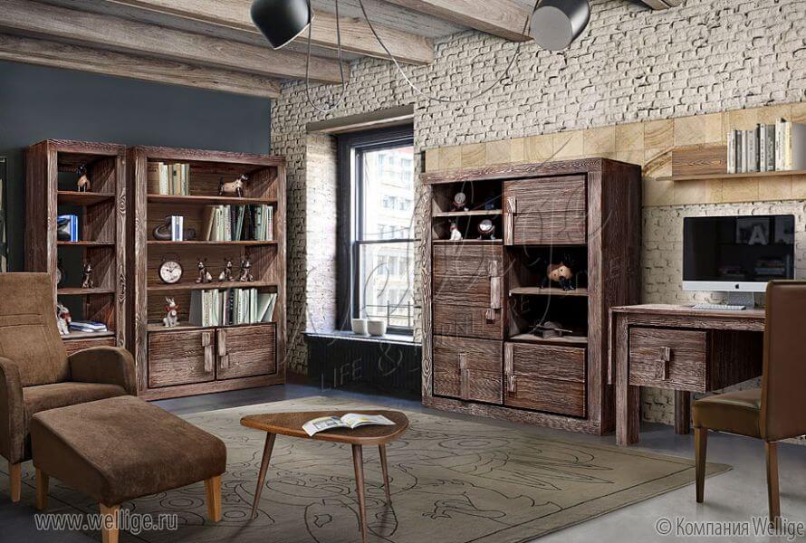 Корпусная мебель в лофт-интерьере используется чаще всего, так как данный стиль предполагает расположение мебели на некотором расстоянии от стены. Она универсальна, практична, ее можно поставить в любом подходящем по параметрам месте. Чаще всего используются столы, комоды, стулья и этажерки, которые обязательно должны быть изготовлены из натуральной древесины.