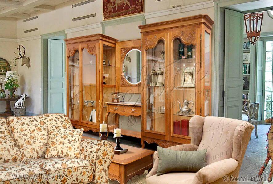 Своеобразная, присущая только провансу атмосфера создается в помещении с помощью расстановки мебельного гарнитура с особыми характеристиками. В интерьерах натуральные материалы используются как в отделке помещений, так и в предметах обстановки. Стеклянная, хромированная мебель или изготовленная из древесностружечных плит ЛДСП, МДФ в данном случае не применимы. Излюбленным видом мебели является деревянная, созданная из массива. Для нее характерны сложные формы и использование красивой фурнитуры. Дополнить обстановку можно плетеными изделиями из тростника или ротанга.
