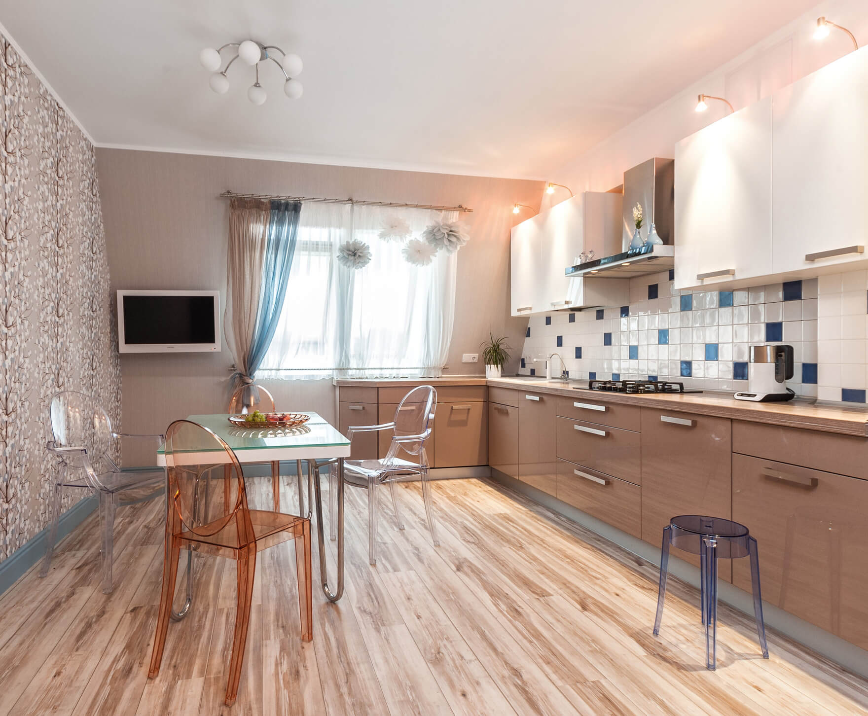 В случае просторной кухни лучше использовать светлые, мягкие оттенки бежевого. Эти цвета лучше других наполнят помещение теплом и уютом. Но не стоит забывать и о холодных тонах. Добавьте несколько элементов в этих оттенках, и интерьер станет более свежим и стильным.