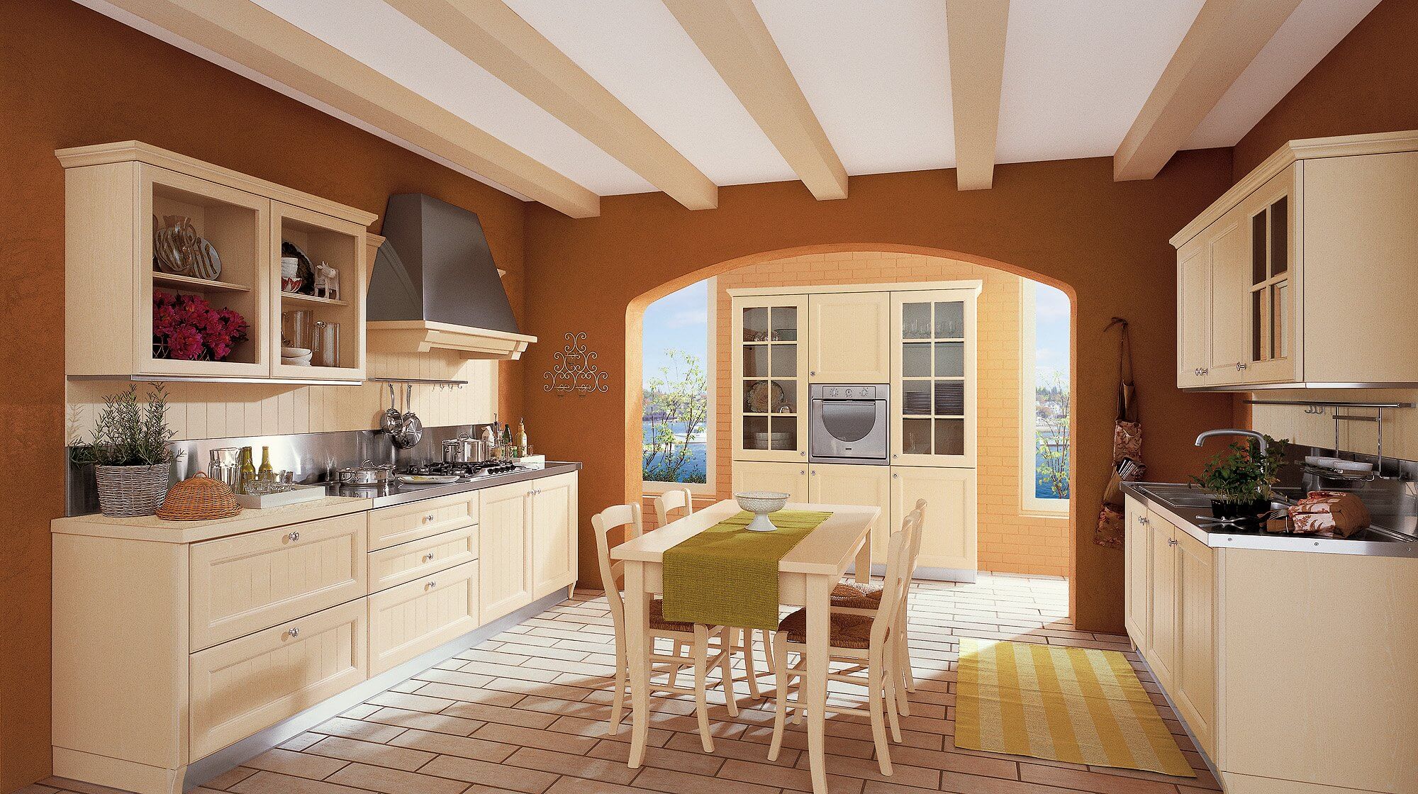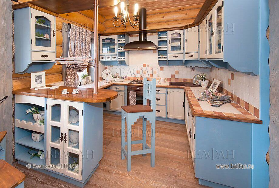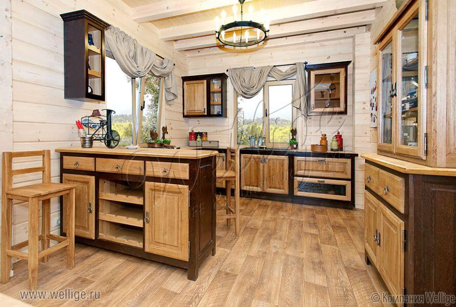 Данное направление берет начало в эпоху колонизации (XVI век). Здесь главными элементами выступают деревянные балки, этнические аксессуары и декор, тяжелая мебель из натуральных материалов. Для интерьера кухни в бежевых тонах подойдут темные оттенки, максимально приближенные к природной древесине.