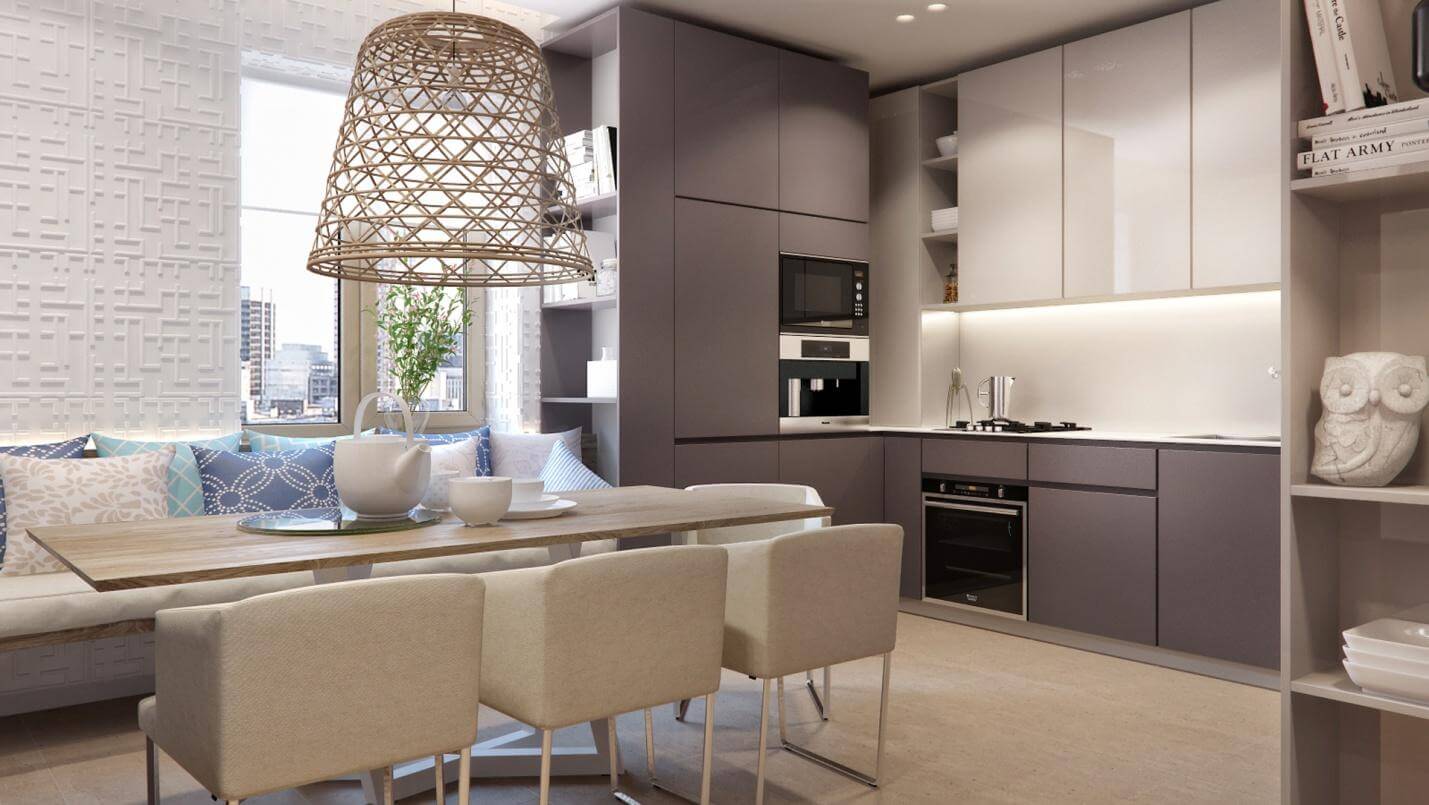 Если в помещении изначально много естественного света, можно остановить выбор на интерьере кухни в серо-бежевых тонах холодного спектра. Если же комната расположена на теневой стороне, подойдут мягкие, теплые оттенки (кремовый, песочный, соломенный и др.).