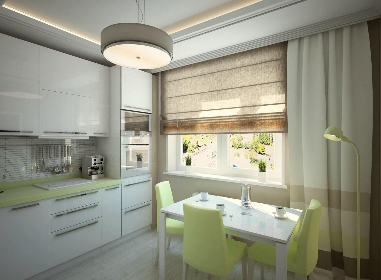 - Зеленый и бежевый – непростое сочетание, которое нуждается в правильном оформлении. Удачно выбранный зеленый оттенок освежит и украсит интерьер кухни в бежевых тонах. При неудачно подобранных цветах помещение будет смотреться грязным.