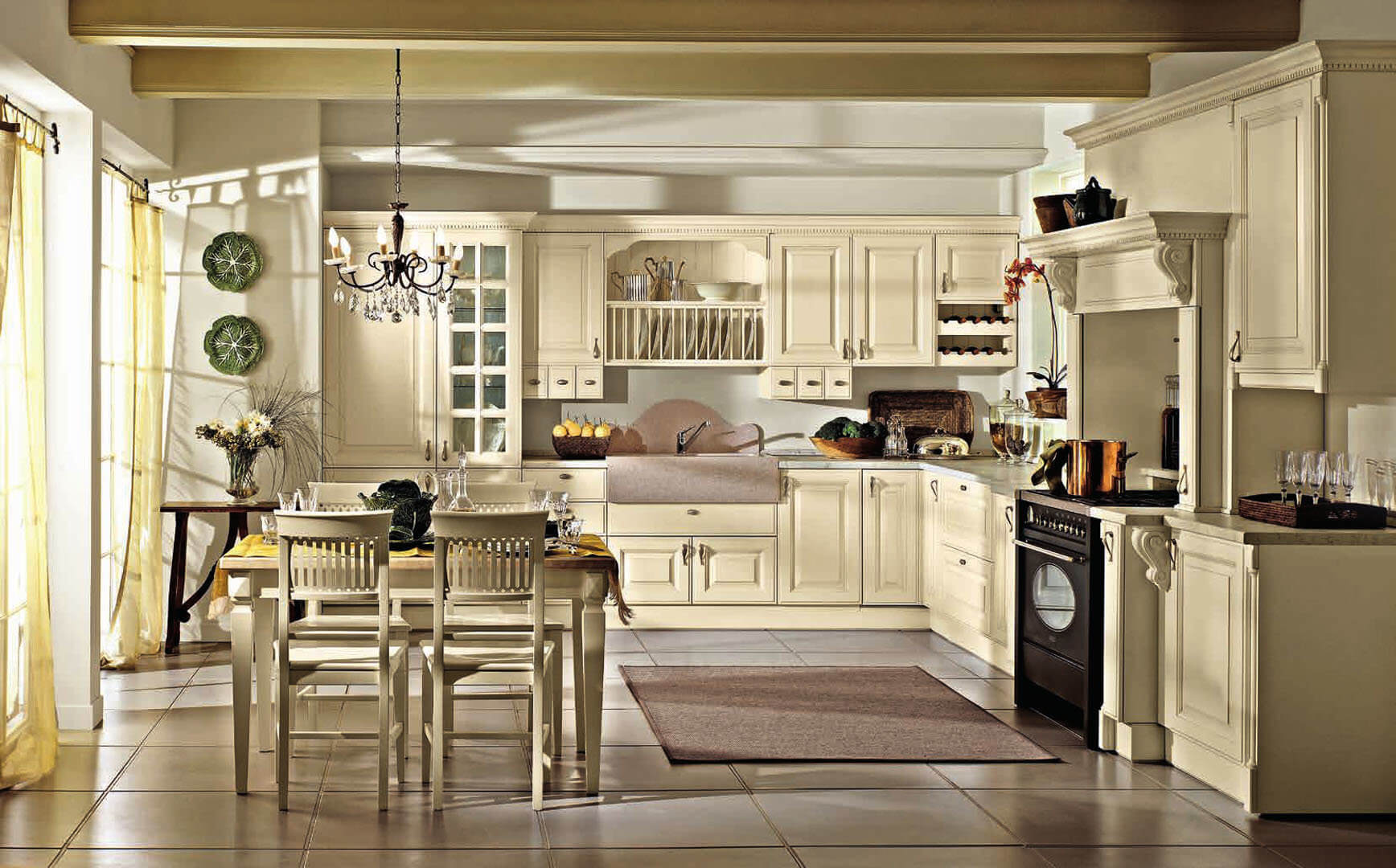 В классике идеально оформлять большие помещения с высокими потолками. Если вы располагаете небольшой кухней, интерьер в бело-бежевых тонах будет оптимальным вариантом. Например: светло-бежевая мебель и белые стены, фартук, шторы и основные аксессуары.
