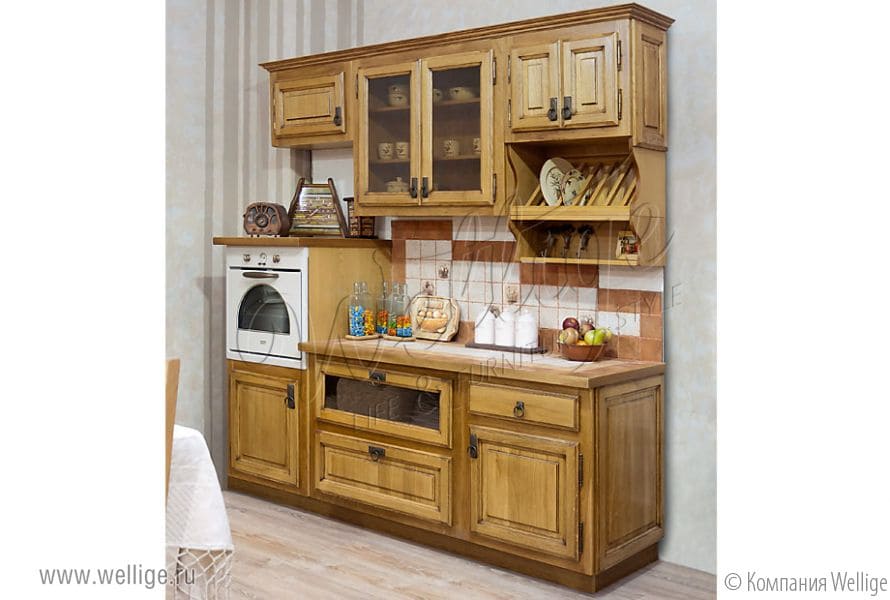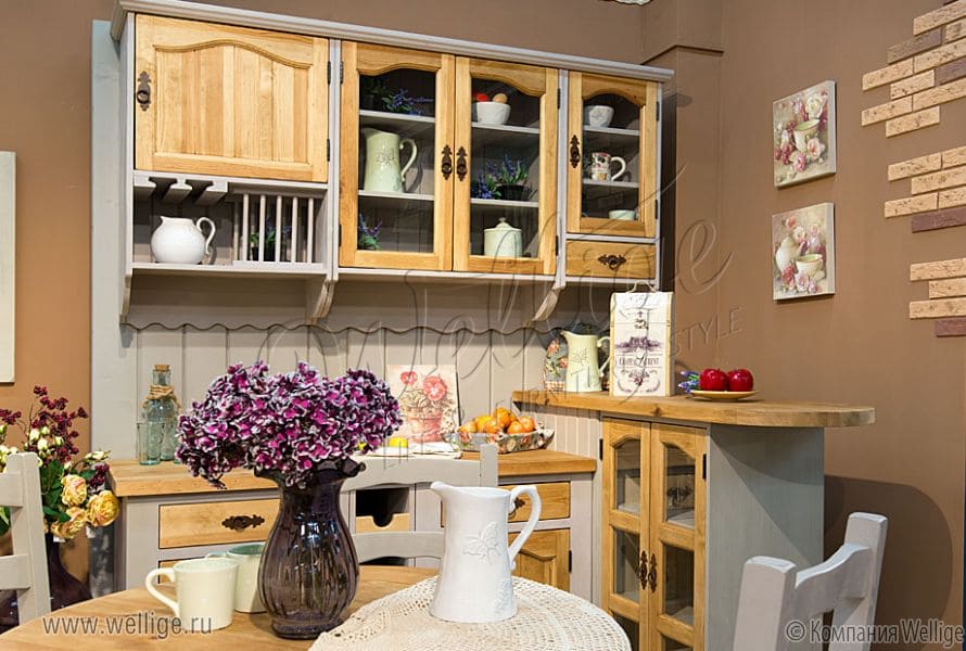 В светлой обстановке прованса бежевый цвет выглядит несколько белесым. Поэтому мы рекомендуем отдавать предпочтение более темным тонам, например, оттенкам дерева. Для отделки мебельных поверхностей подойдет натуральная древесина. Удачно смотрятся стеклянные вставки в кухонных шкафчиках. Вы видите их на картинке ниже. Вместо стеклянных элементов часто используют простые льняные занавески – они создают атмосферу уютного деревенского домика. Посуду можно выставить на передний план как составной элемент дизайна.