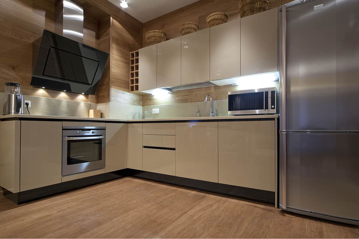 Зрительно расширить пространство кухни вам помогут светлые бежевые цвета. Если большинство предметов мебели, а также пол и стены оформлены в бежевом тоне, границы комнаты будто расширяются: она кажется светлее и просторнее.