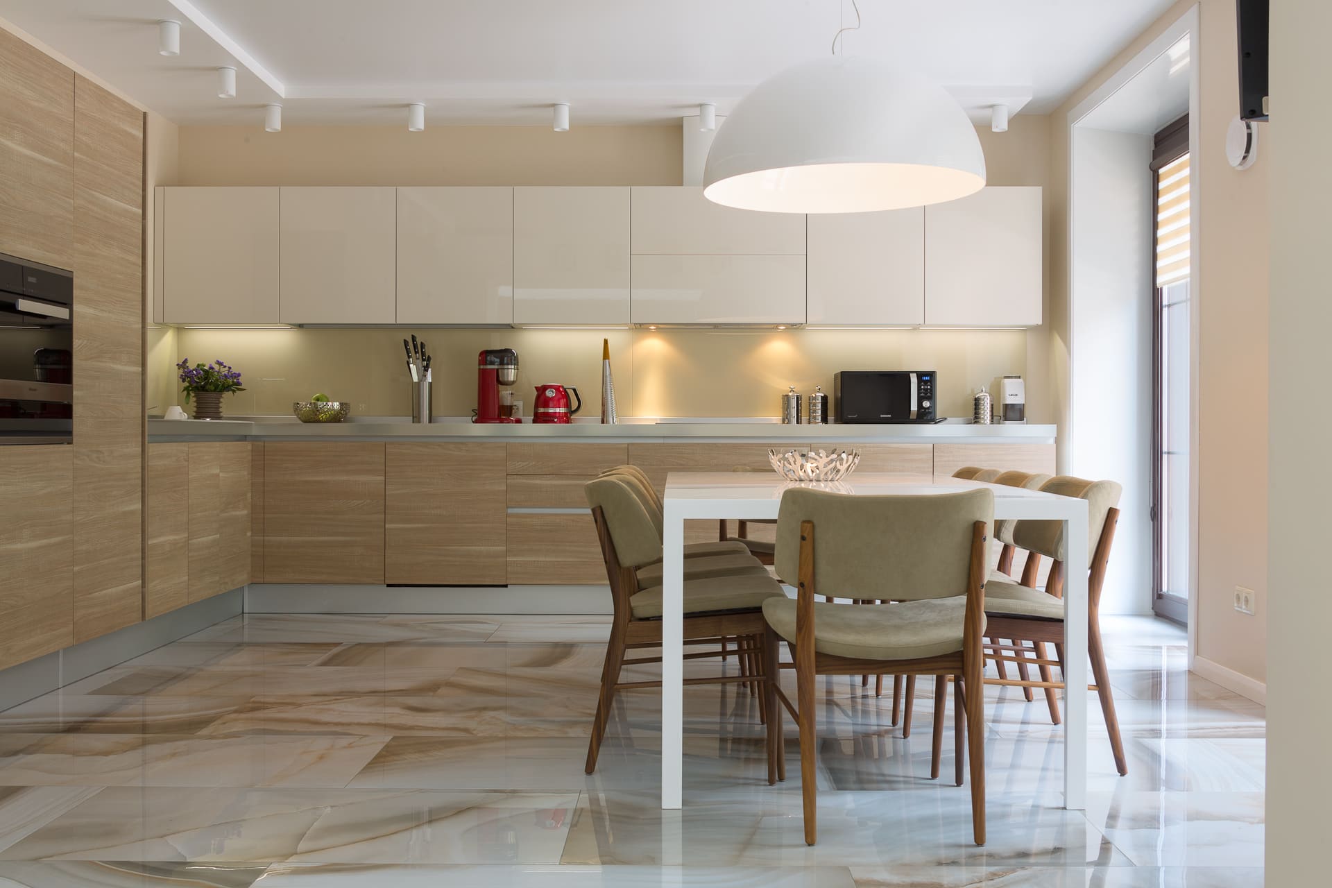 Удобный и практичный вариант пола для кухни в теплых тонах – покрытие из керамогранита, керамической плитки или наливное. Данные материалы отличаются высокой прочностью, долговечностью и износостойкостью. Пол можно дополнить системой обогрева, который привнесет в помещение дополнительный комфорт.