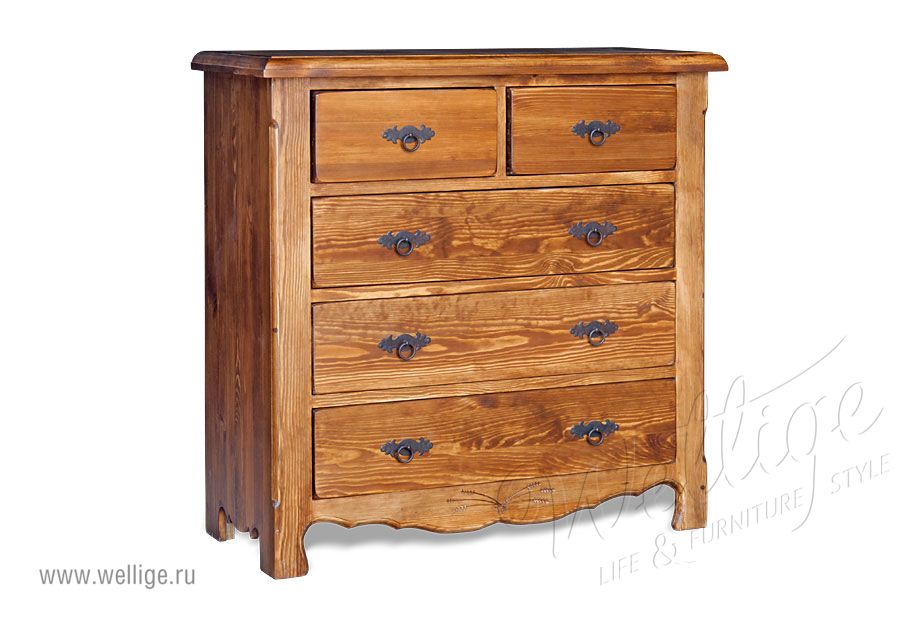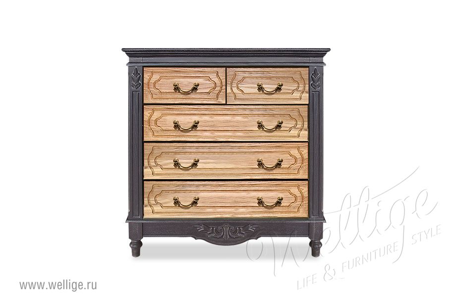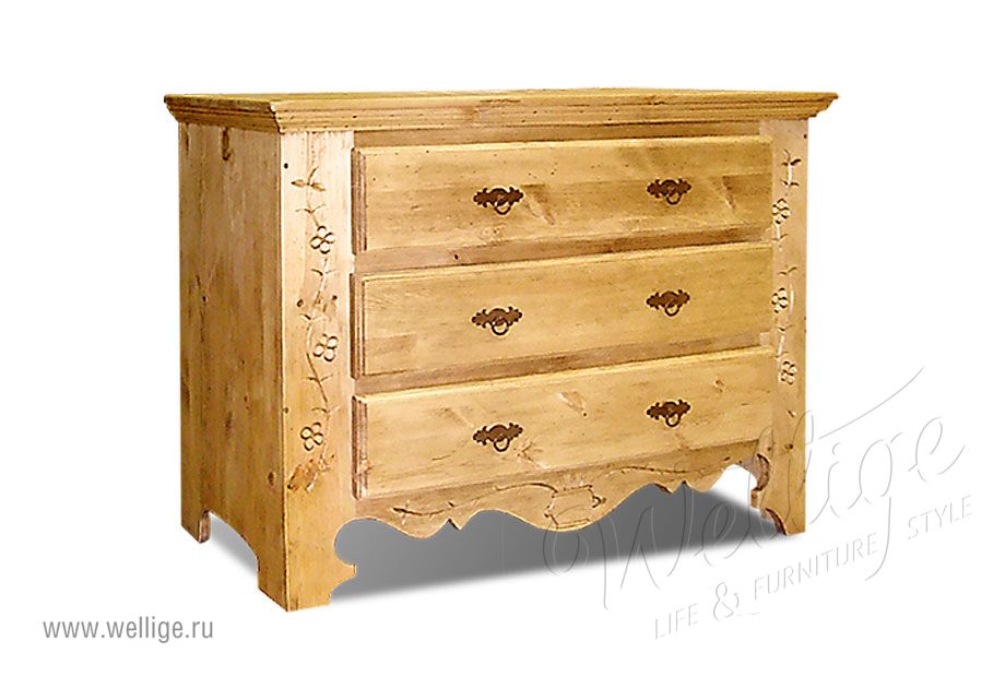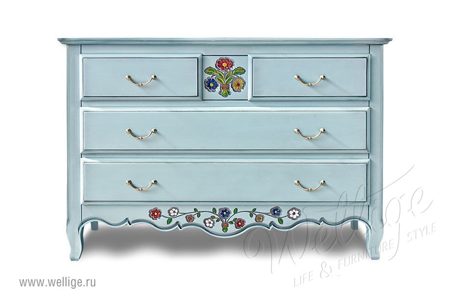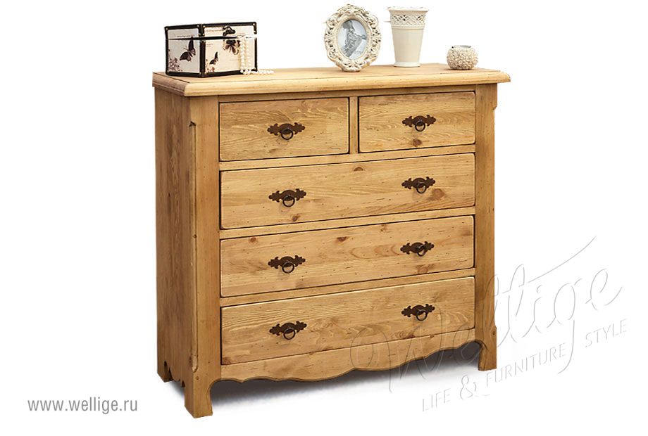 Для того чтобы придать комоду больше элегантности, его покрывают лаком. Кроме того, часто используется патирование и отделка под старину. Декоративными элементами в данном случае являются декупаж, резьба и роспись геометрическим или растительным узором. Как правило, мебель этого направления выглядит несколько небрежно, с присущей ей простотой и шармом романтизма.