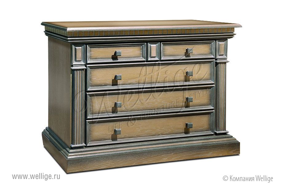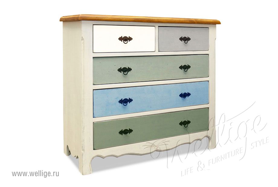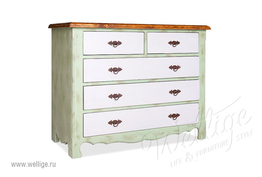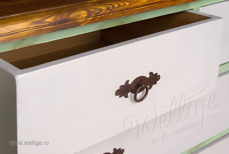 Комод обязательно должен быть «состаренного» вида, с немного облезшей матовой краской приглушенного цвета.