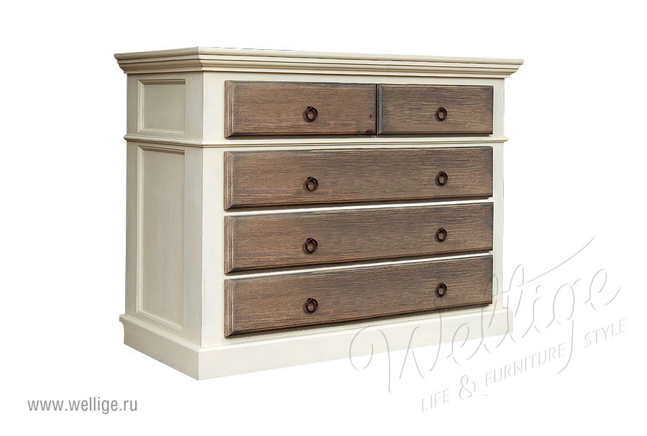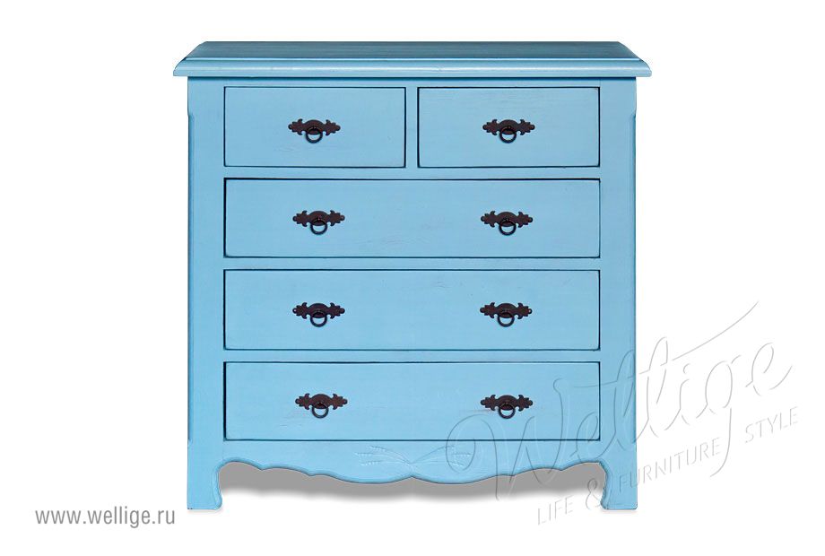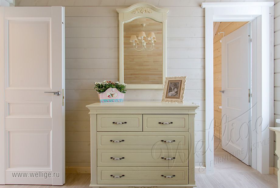 Комод, как и остальная мебель этого стилистического направления, обрабатывается для придания ему состаренности с помощью искусственных потертостей. Подобного эффекта можно добиться и с помощью краски кракелюр.