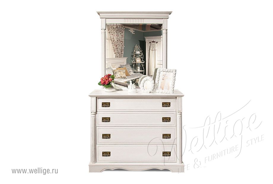 Традиционная модель в стиле прованс имеет не менее пяти больших выдвижных ящиков. Они чаще всего используются для того, чтобы хранить одежду и постельное белье. Дополнительно имеется два небольших для различных аксессуаров и мелочей. При использовании комода в качестве туалетного столика его необходимо дополнить большим зеркалом соответствующего стилистического направления. Для хранения габаритных вещей, например, одеяла и подушек, дополнительно имеются полки с закрытыми фасадами.
