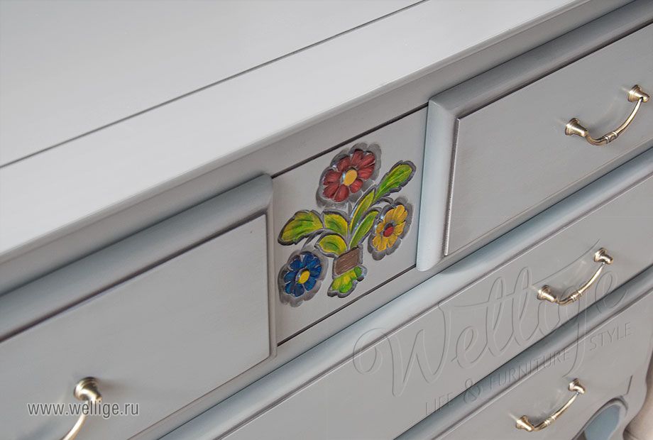 Для того чтобы придать комоду больше элегантности, его покрывают лаком. Кроме того, часто используется патирование и отделка под старину. Декоративными элементами в данном случае являются декупаж, резьба и роспись геометрическим или растительным узором. Как правило, мебель этого направления выглядит несколько небрежно, с присущей ей простотой и шармом романтизма.