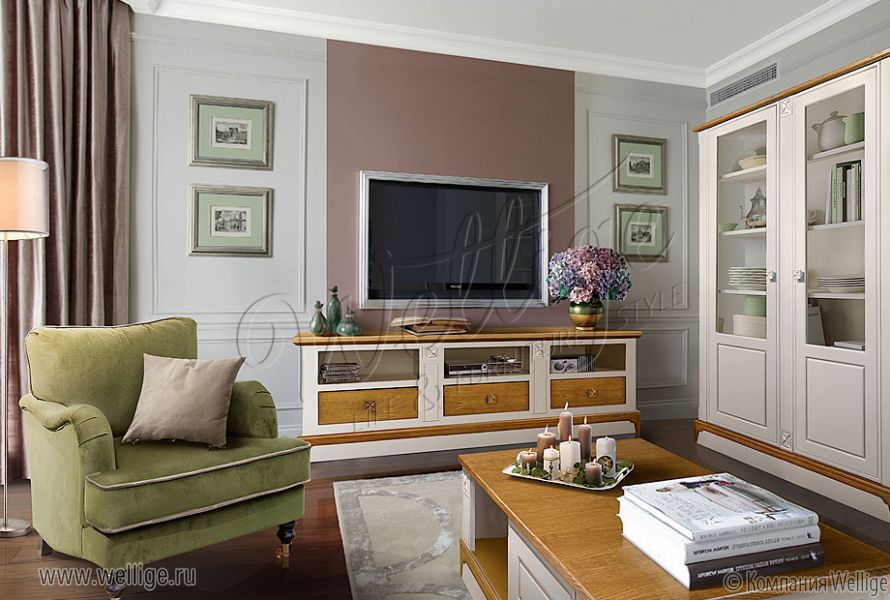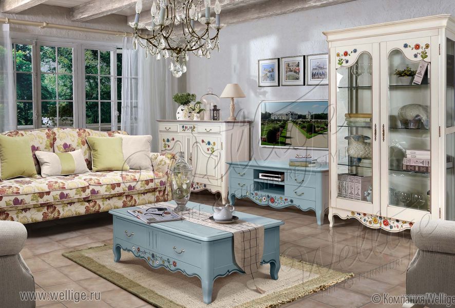 Если говорить о гостиной, то здесь вариантов относительно того, как поставить комод в стиле прованс, гораздо больше. Довольно часто он используется в качестве тумбы, на которую ставится телевизор, вазы с цветами либо картины. Как и в случае со спальней, на него можно поставить зеркало.