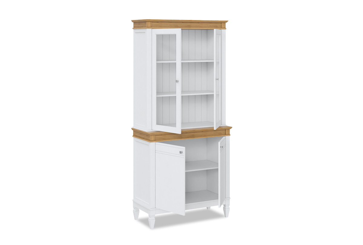 Буфет «Ольса» 220/220 – это стильный классический дизайн и преимущества натурального дерева. Он сделан из настоящей сосны, которая отличается приятными тактильными и эстетическими свойствами. Верх представляет собой стеклянную витрину с двумя полками. Низ – комод с глухими распашными дверями. Дополнительная изюминка – металлические квадратные ручки под старину.