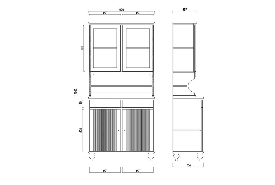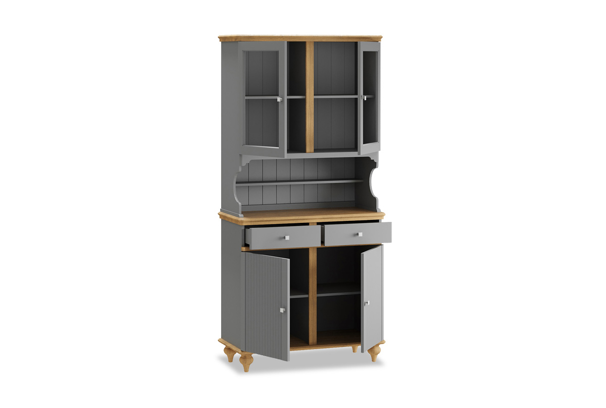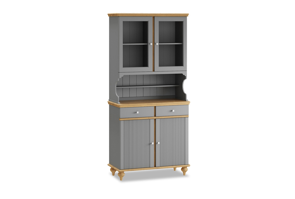 Буфет «Рандеву» 222 в цвете «серый 7042+антик 24» из массива сосны. Оснащен двумя распашными дверками с полками внутри и двумя ящиками снизу, двумя распашными, стеклянными, дверками сверху. Фурнитура на дверях и ящиках с доводчиками. Высокие ножки обеспечивают оптимальный доступ при уборке.