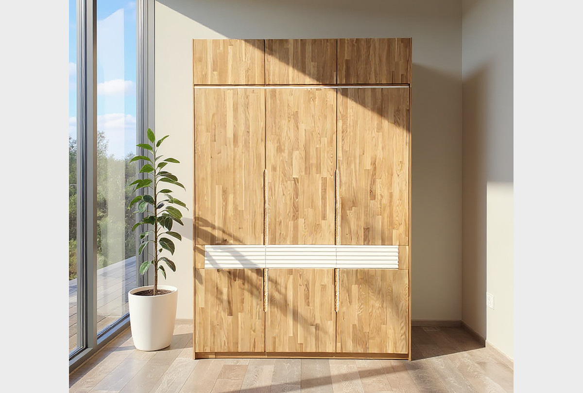 Секция для трехдверного шкафа для одежды Уоллстрит в цвете «к-бейц-масло, ф-бейц-масло, вн-белый» с сочетанием текстуры натурального дерева и акцентных вставок. Сдержанно-светлая цветовая гамма, фасады в цвете на выбор. Дополнительная секция (антресоль) отлично подходит для сезонных вещей, постельного белья или других предметов, для которых никогда не хватает места в обычном шкафу. Высокий шкаф в потолок – это разумное и функциональное использование пространства!