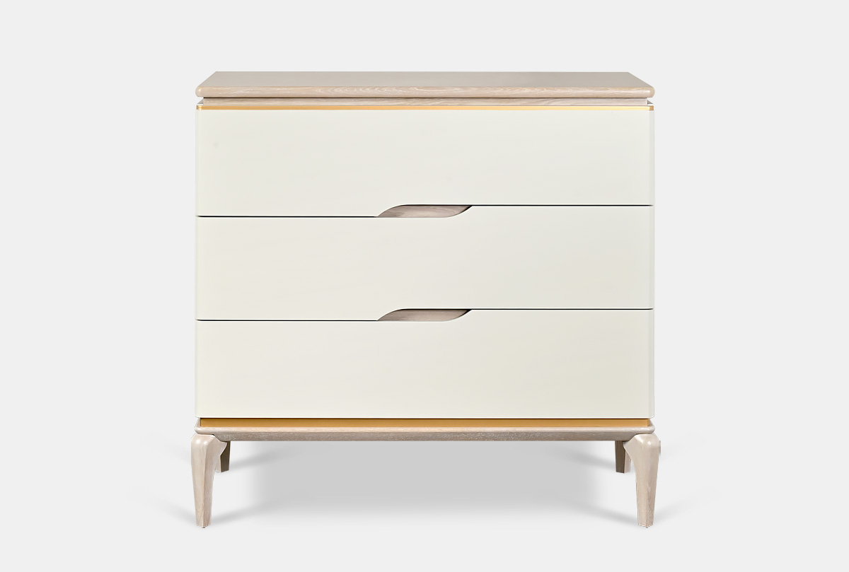 Комод «Алекса» в цвете "айвори + жемчужный дуб, золотая патина" 3 ящика, выполненный в стиле современная классика, имеет неповторимый дизайн, благодаря сочетанию благородной текстуры дуба и сатиновых фасадов с эффектом сияния. Золотая патина придает объем и подчеркивает утонченность изделия. Комод станет не только стильным элементом вашей спальни, но и незаменимым предметом мебели, так как его функциональность нисколько не уступает его красоте. Сочетание выдвижных ящиков и распашных дверей позволит вам легко и комфортно использовать комод для хранения самых разнообразных вещей.