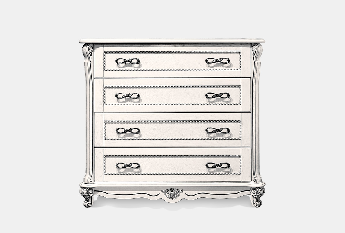 Комод из коллекции «Алези» (Alezi) отлично подойдет для квартир или загородных домов, меблированных в итальянском стиле. Он оснащен четырьмя вместительными выдвижными ящиками с качественными доводчиками, обеспечивающими бесшумное закрывание. Обилие декоративных элементов (инкрустации по технологии маркетри, оригинальная фурнитура, пилястры и фигурный цоколь) и благородные оттенки делают этот комод настоящим произведением искусства.