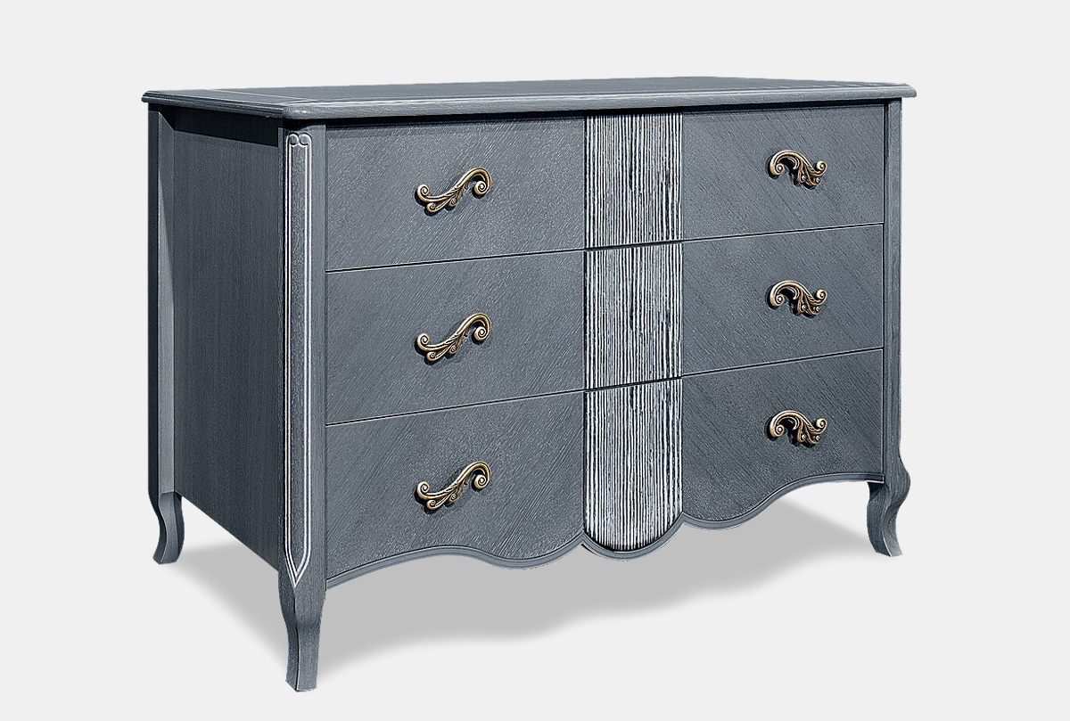 Комод из коллекции Katrin (Катрин) станет отличным дополнением к Вашей спальне – он обеспечит дополнительным местом для хранения, 3 глубоких и вместительных выдвижных ящика позволят хранить одежду или постельные принадлежности. Выполненный из массива и шпона дуба, этот комод выглядит эффектно и утонченно благодаря изящной фурнитуре, изогнутым ножкам и волне по нижнему краю. Белая патина, нанесенная вручную, завершает облик изысканного предмета мебели.