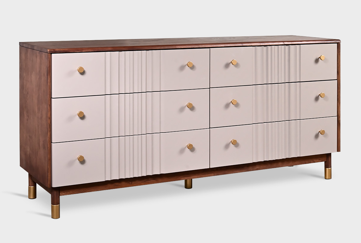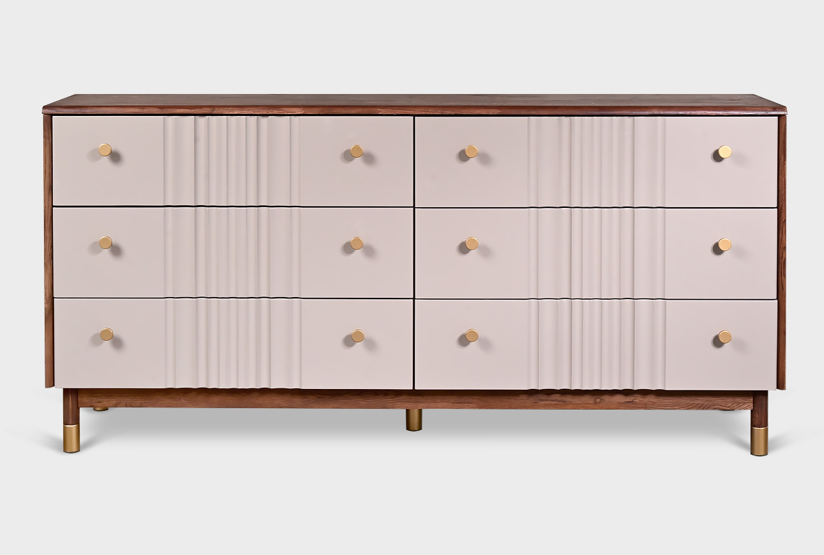 В коллекции «Меридиан» каждый предмет словно создан художником — она наполнена ритмом, изяществом и утонченностью. Волнообразные фасады будто переносят текстуру мягкой ткани на древесную плоскость, создавая игру света и тени. Высокие ножки придают легкость, а минималистичная позолоченная фурнитура добавляет изысканный штрих.
