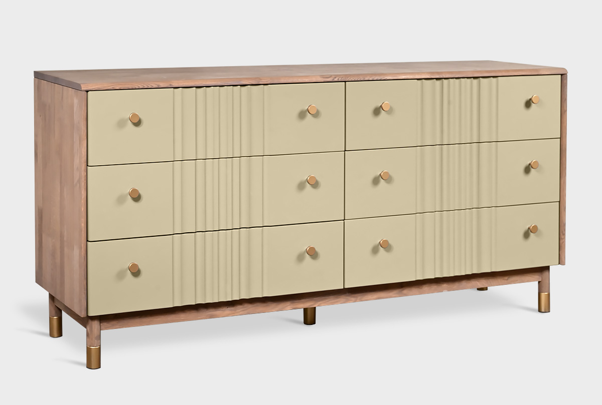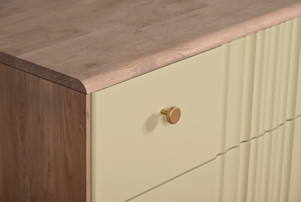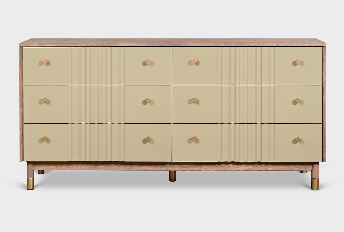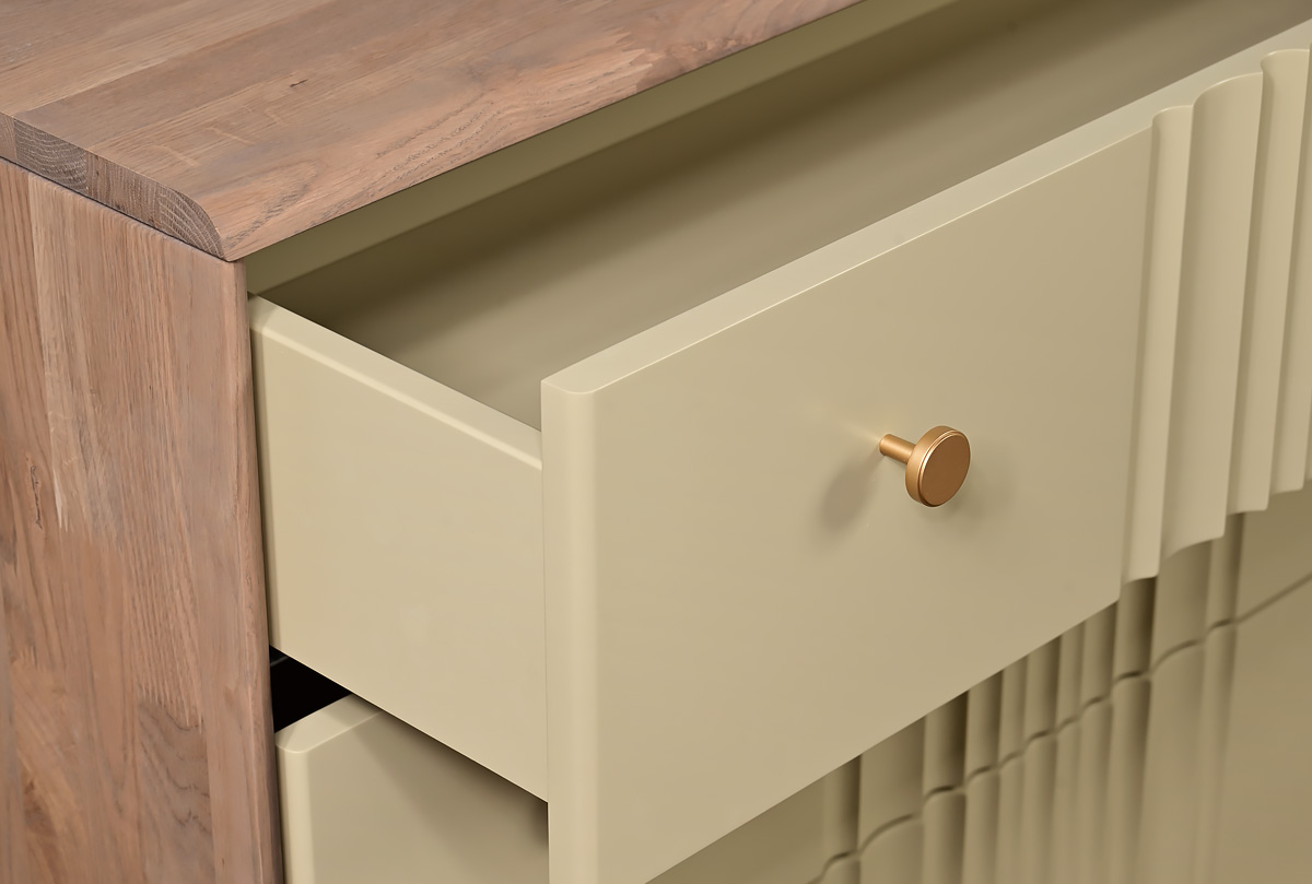 В коллекции «Меридиан» каждый предмет словно создан художником — она наполнена ритмом, изяществом и утонченностью. Волнообразные фасады будто переносят текстуру мягкой ткани на древесную плоскость, создавая игру света и тени. Высокие ножки придают легкость, а минималистичная позолоченная фурнитура добавляет изысканный штрих.