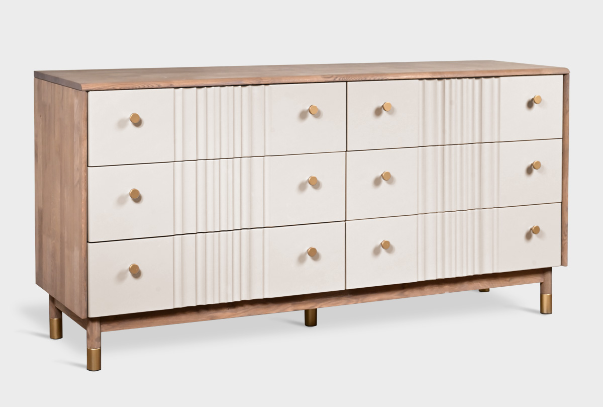 В коллекции «Меридиан» каждый предмет словно создан художником — она наполнена ритмом, изяществом и утонченностью. Волнообразные фасады будто переносят текстуру мягкой ткани на древесную плоскость, создавая игру света и тени. Высокие ножки придают легкость, а минималистичная позолоченная фурнитура добавляет изысканный штрих.