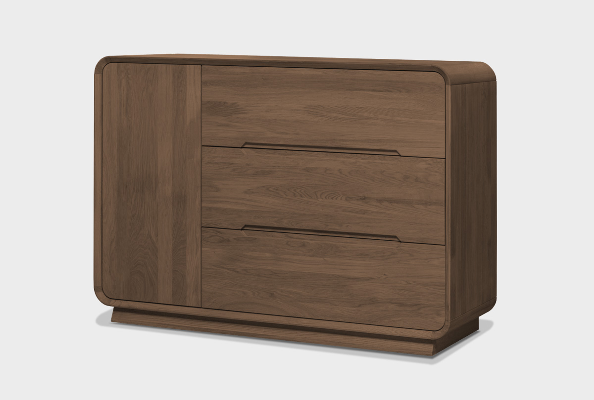 ✅ Комод оснащен тремя просторными выдвижными ящиками и дополнительным отделением с дверцей, за которой расположена практичная полка, что обеспечивает удобное хранение вещей и помогает сохранять порядок в спальне.
