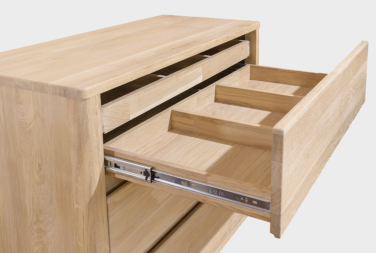 Стиль Лофт, в котором выполнен комод «Норд» в цвете «белёный дуб» – это натуральные материалы и национальное своеобразие. Минималистические фасады комода, которые лишены ручек, находятся на пике мебельной моды. Зато выдвижные ящики могут похвастаться оригинальными и практичными профиль-нишами – специальными выемками на краях для максимально удобного открывания. А направляющие с доводчиками производства Германия обеспечат плотное и бесшумное закрывание ящиков.