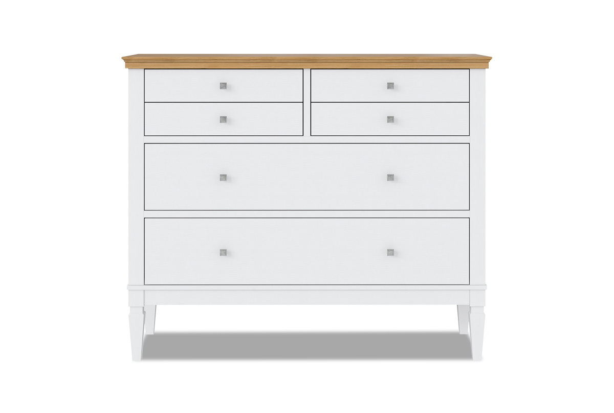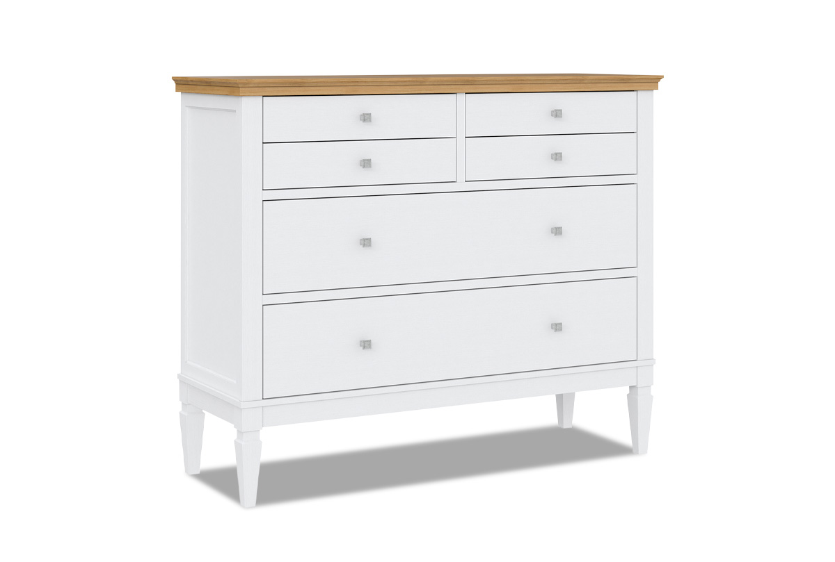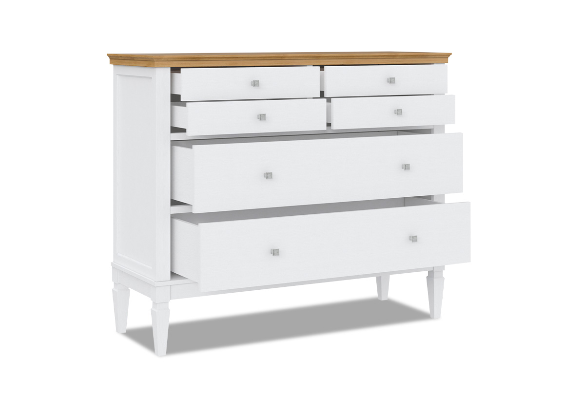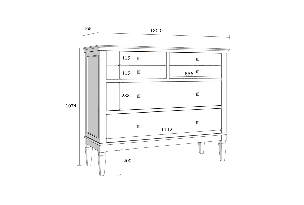 Комод «Ольса» 042. Размеры (ШxВxГ) 1300 x 1074 x 465 мм. Комод оснащен двумя большими и четырьмя маленькими ящиками. Фурнитура на ящиках с доводчиками. Высокие ножки обеспечивают оптимальный доступ при уборке.