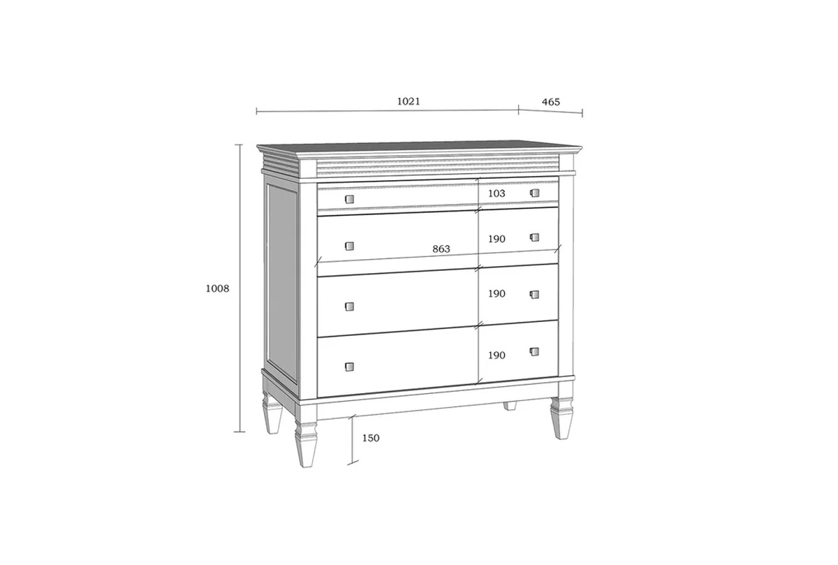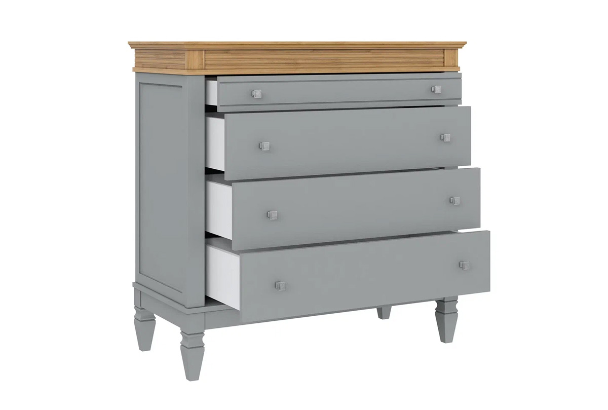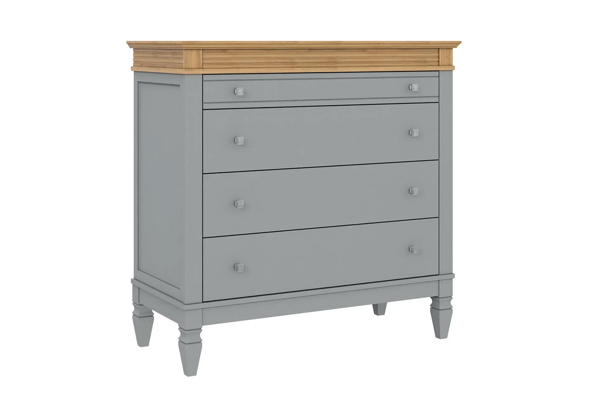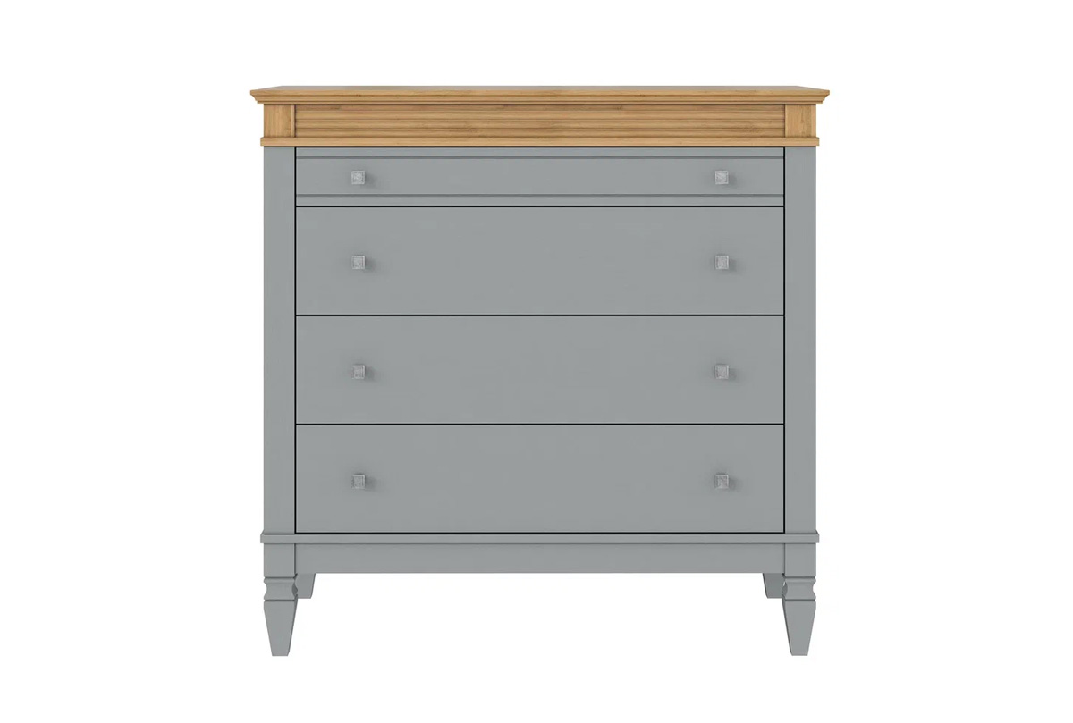 Комод «Ольса» 204. для гостиной, спальни или прихожей. Состоит из четырех выдвижных ящиков, верхний чуть менее глубокий. С лицевой стороны установлены квадратные металлические ручки под состаренное серебро,i