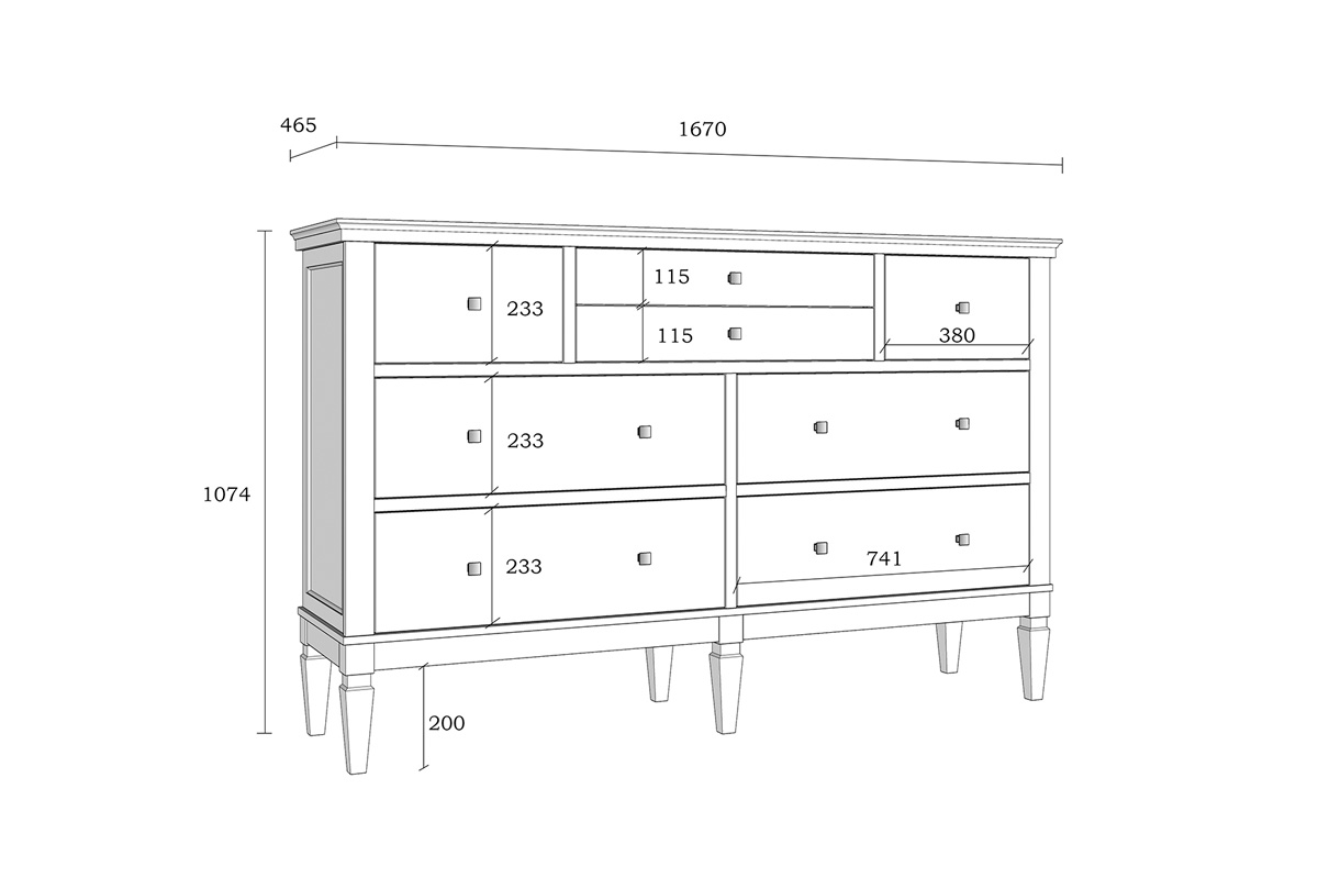 Комод «Ольса» 224. Размеры (ШxВxГ) 1670 x 1074 x 465 мм. Комод оснащен четырьмя большими и четырьмя маленькими ящиками. Фурнитура на ящиках с доводчиками. Высокие ножки обеспечивают оптимальный доступ при уборке.