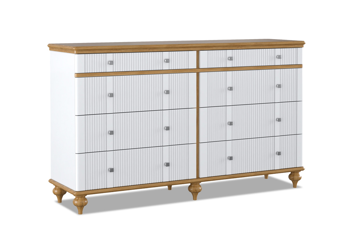 Комод «Рандеву» (8 ящиков) в цвете «белый лак+антик 24». Размеры (ШxВxГ) 1667 x 995 x 461 мм. Комод оснащен восемью ящиками. Фурнитура на ящиках с доводчиками. Высокие ножки обеспечивают оптимальный доступ при уборке.