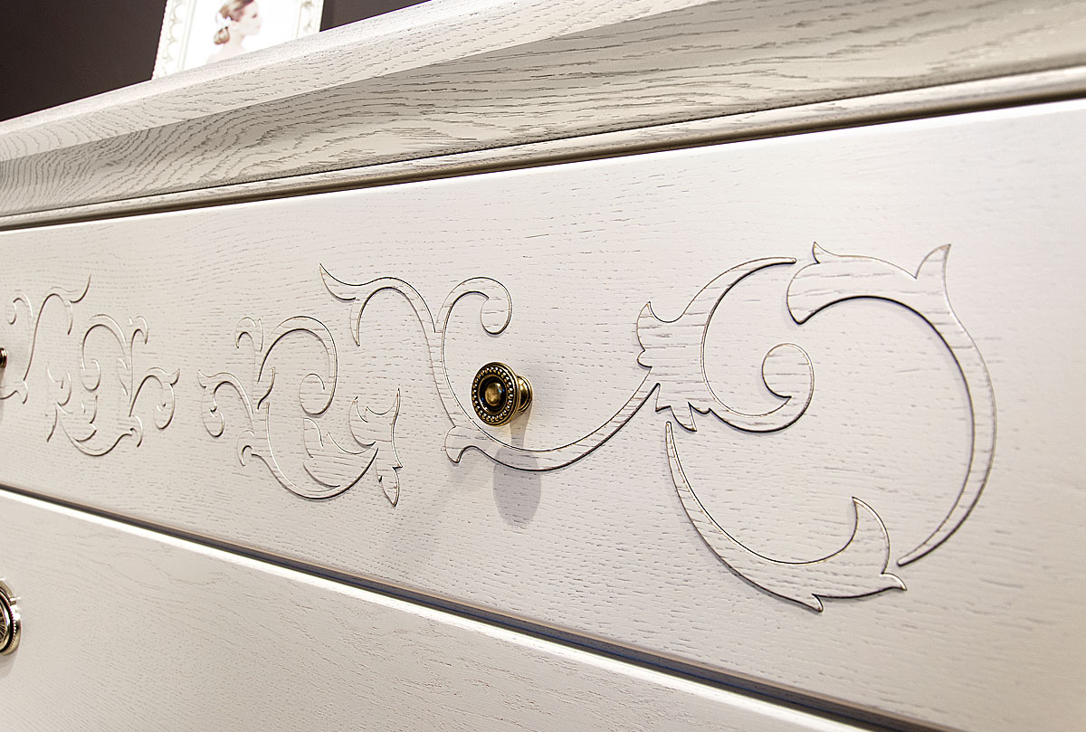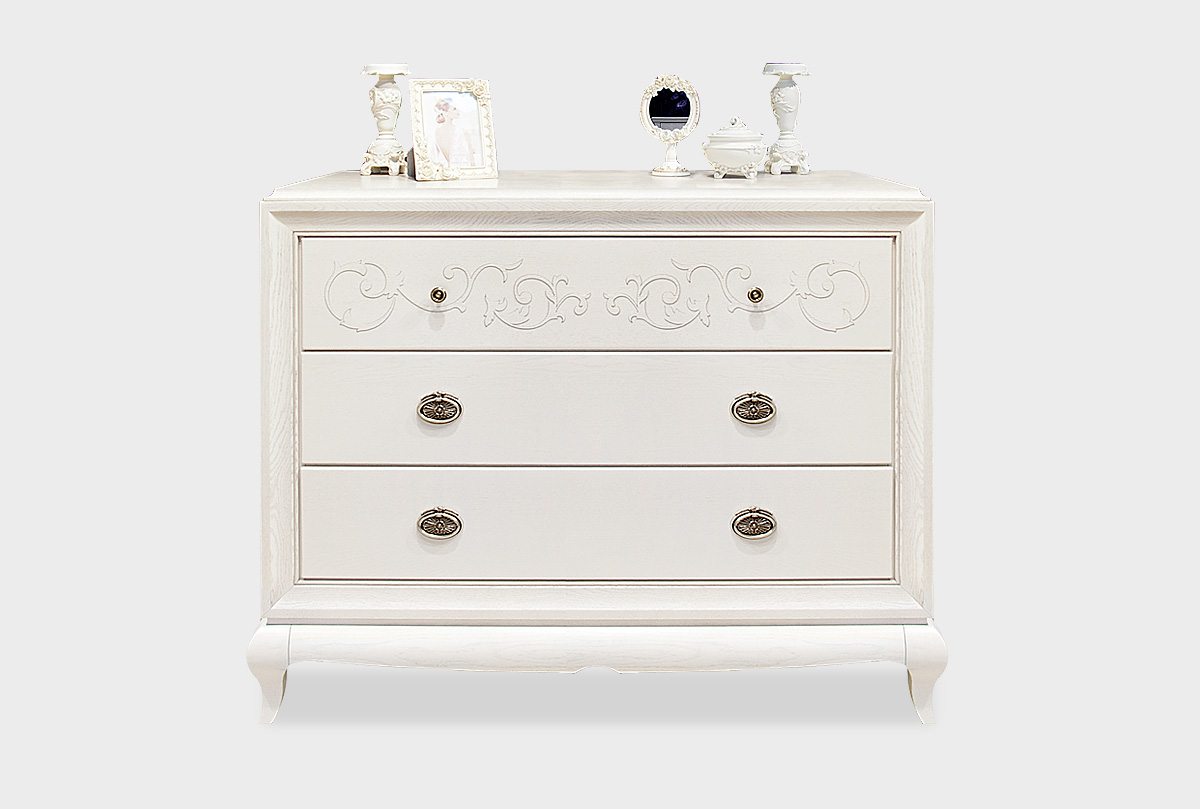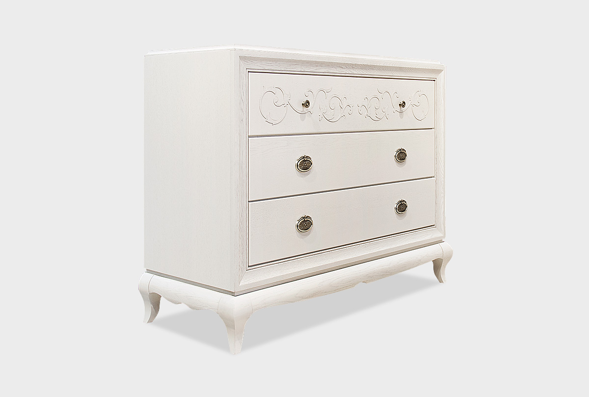 Массивный комод «Соната» в цвете «белая эмаль с темной патиной» сочетает в себе все то, что так нравится любителям итальянского стиля. Несомненная роскошь, благородные оттенки и изящная резьба – все это воплотилось в комоде Sonata. Оригинальная «винтажная» фурнитура перенесет Вас в Италию времен Возрождения, а традиционный дизайн комода напомнит о крепких семейных узах итальянцев. На высшем уровне не только красота, но и функциональность: три глубоких выдвижных ящика без проблем вместят постельное белье даже большой семьи. Согласитесь, такую мебель хочется передавать из поколения в поколение, и, может быть, этот комод действительно станет вашей семейной реликвией.