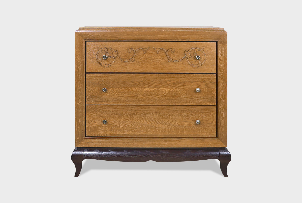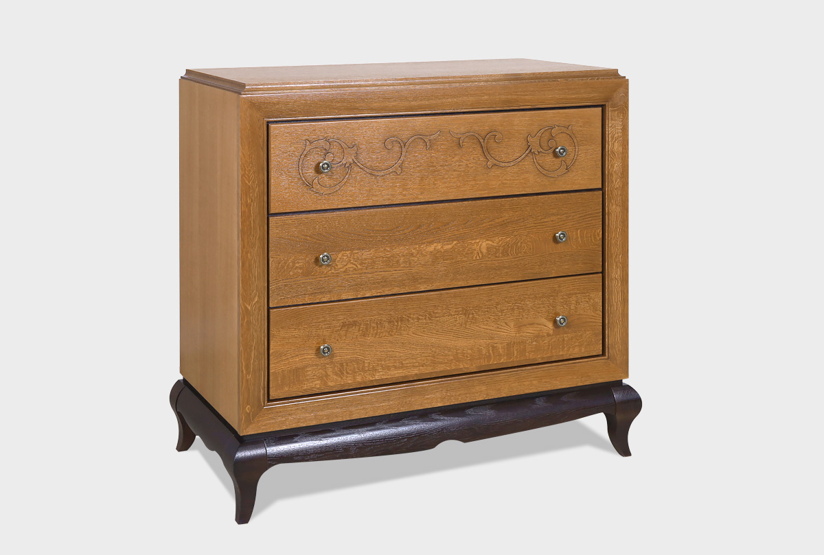 Массивный узкий комод «Соната» в цвете «коньяк с тёмной патиной+горький шоколад» сочетает в себе все то, что так нравится любителям итальянского стиля. Несомненная роскошь, благородные оттенки и изящная резьба – все это воплотилось в комоде Sonata. Оригинальная «винтажная» фурнитура перенесет Вас в Италию времен Возрождения, а традиционный дизайн комода напомнит о крепких семейных узах итальянцев. На высшем уровне не только красота, но и функциональность: три глубоких выдвижных ящика без проблем вместят постельное белье даже большой семьи. Согласитесь, такую мебель хочется передавать из поколения в поколение, и, может быть, этот комод действительно станет вашей семейной реликвией.