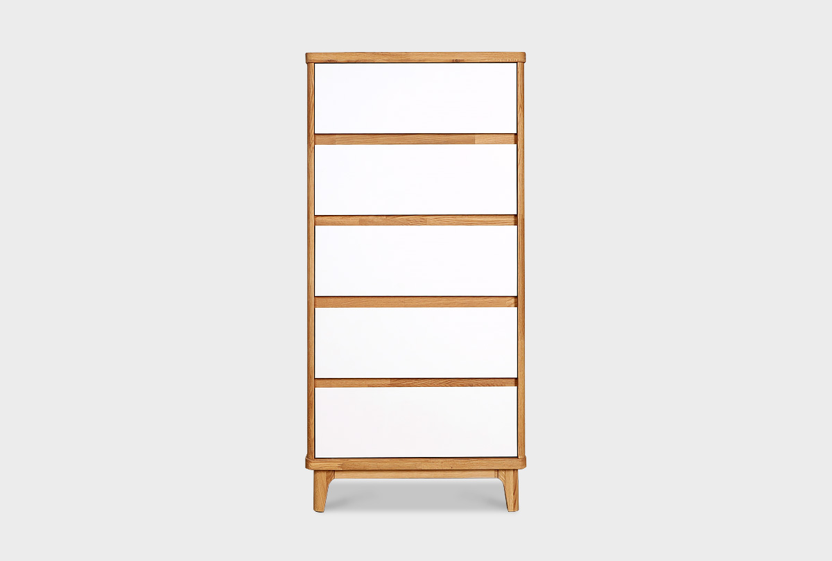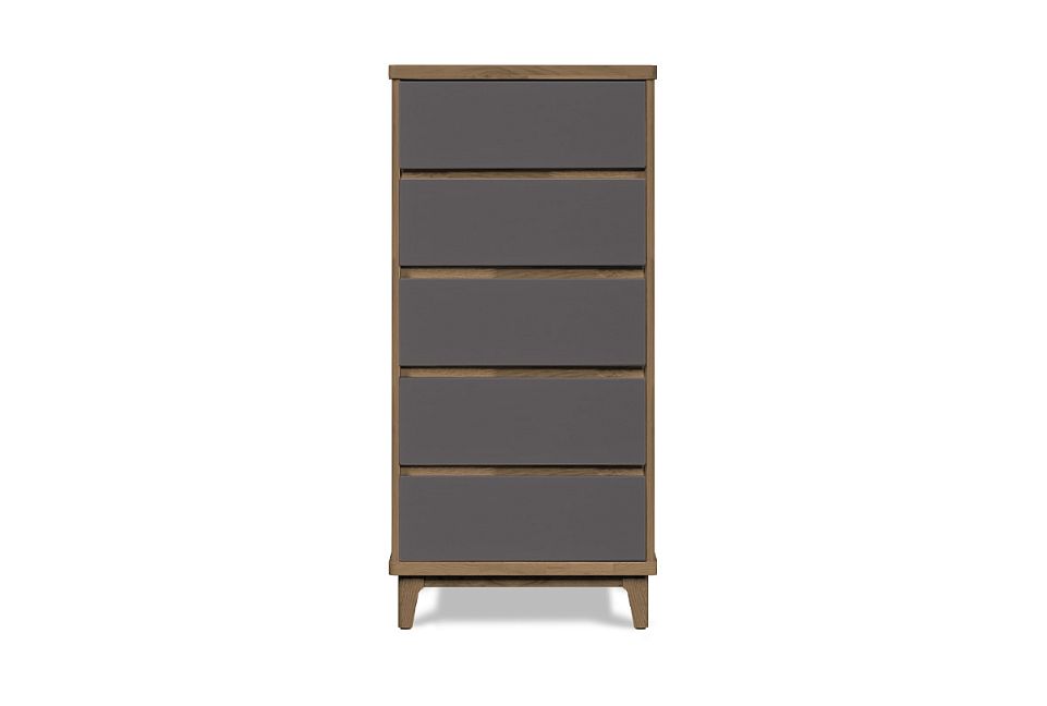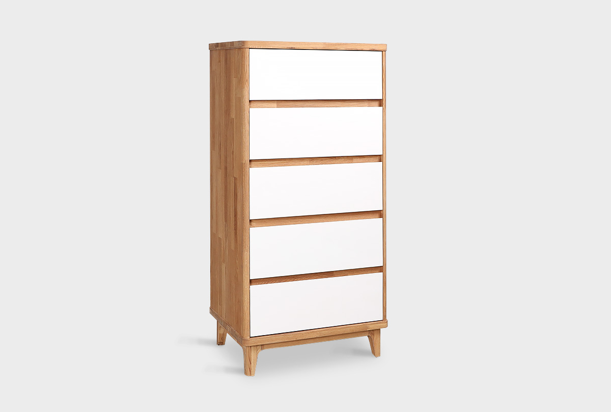 Высокий узкий комод Уоллстрит в цвете «к-бейц-масло, ф-белый, вст-бейц-масло» с пятью ящиками из натурального дуба.
