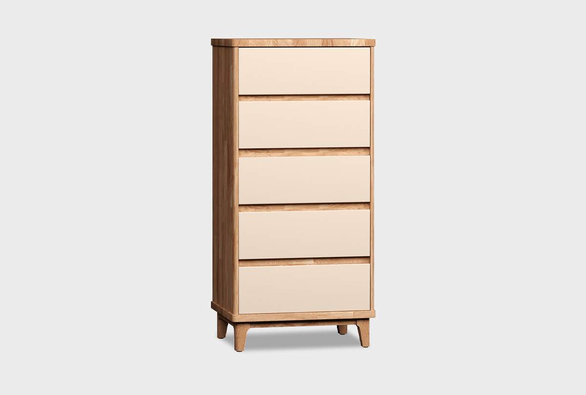Высокий узкий комод Уоллстрит в цвете «к-бейц-масло, ф-нюд, вст-бейц-масло» с пятью ящиками из натурального дуба.