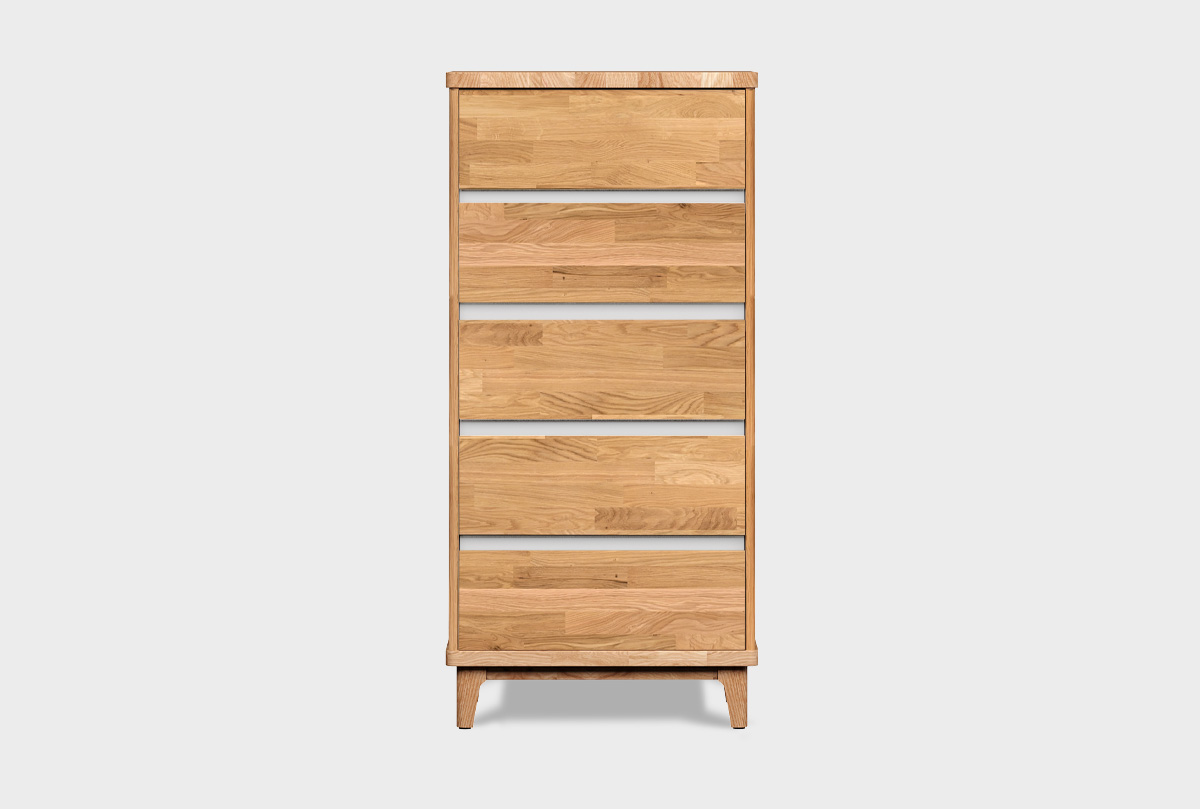 Высокий узкий комод Уоллстрит в цвете «к-бейц-масло, ф-бейц-масло, вст-белый» с пятью ящиками из натурального дуба.