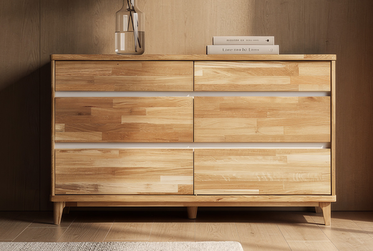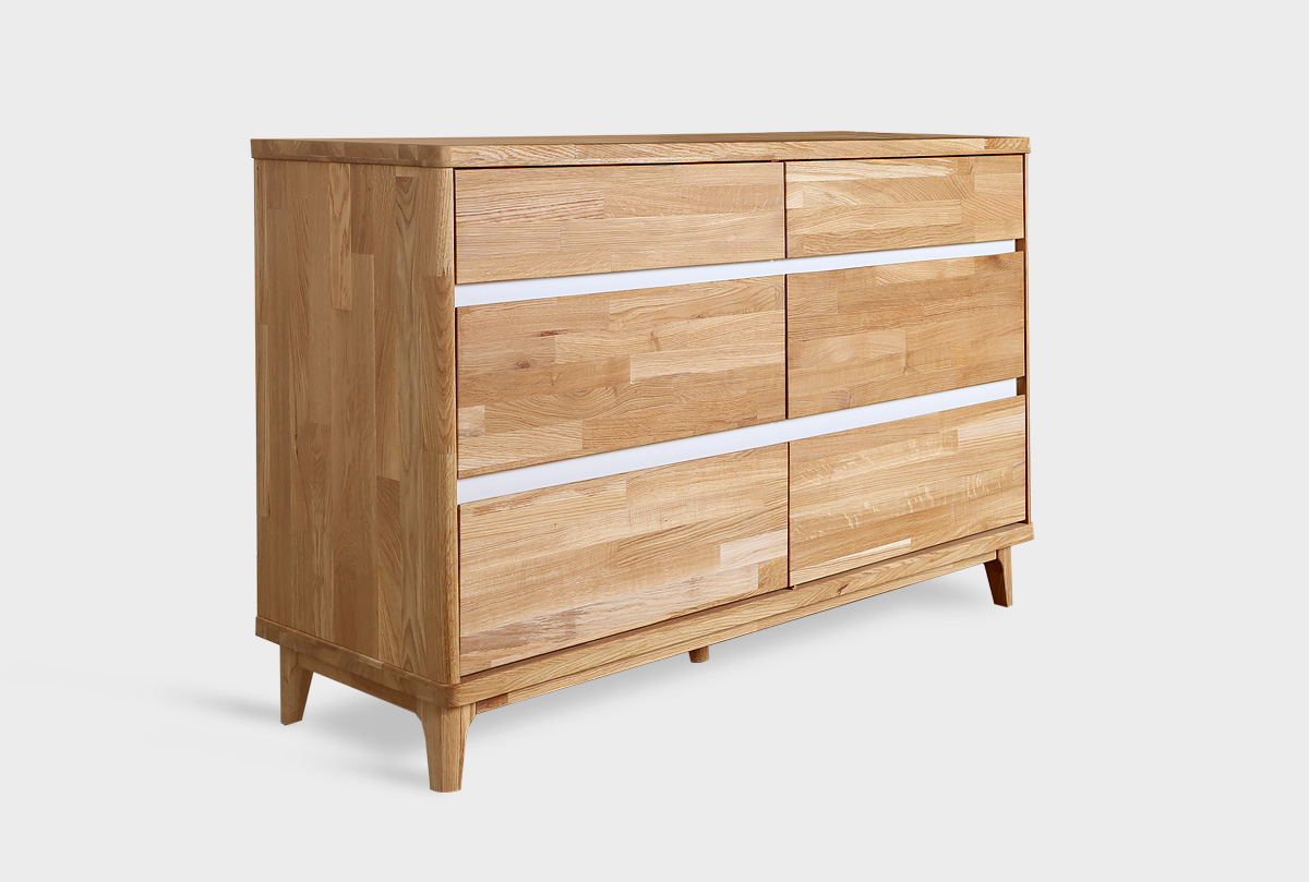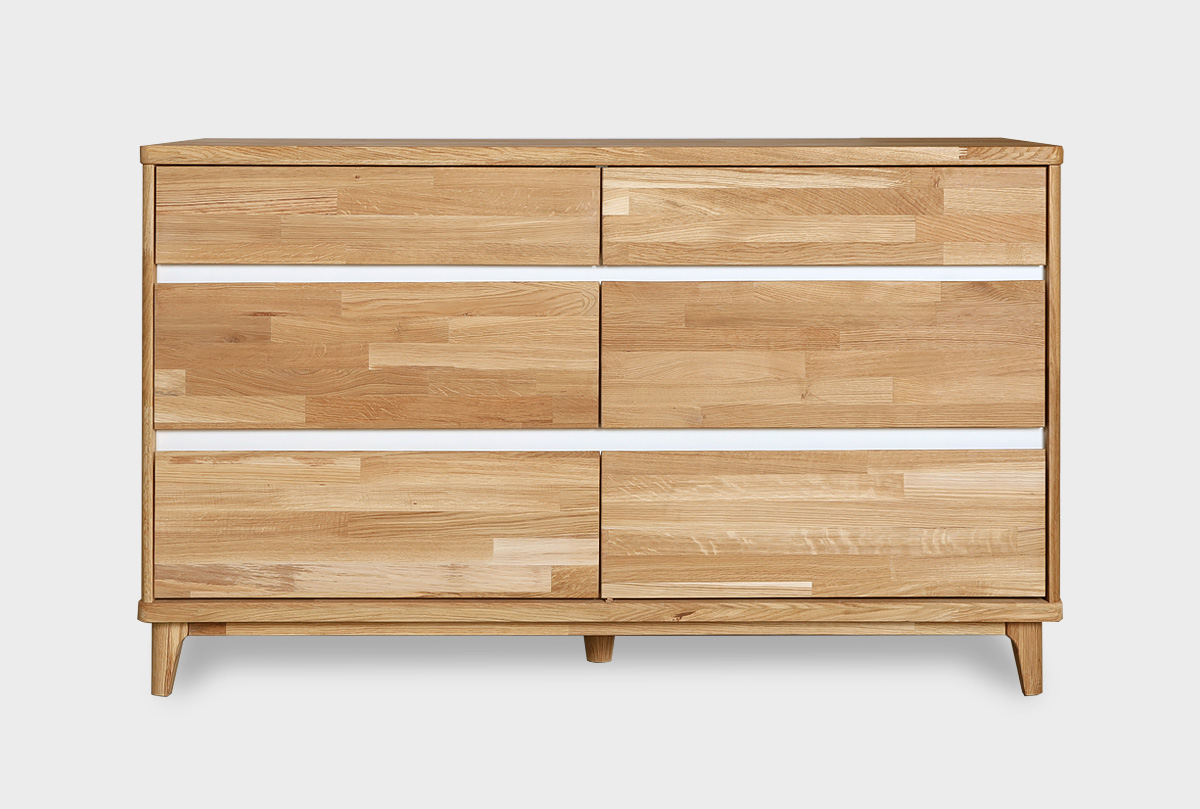 Широкий комод Уоллстрит в цвете «к-бейц-масло, ф-бейц-масло, вст-белый» для спальни из натурального дуба.