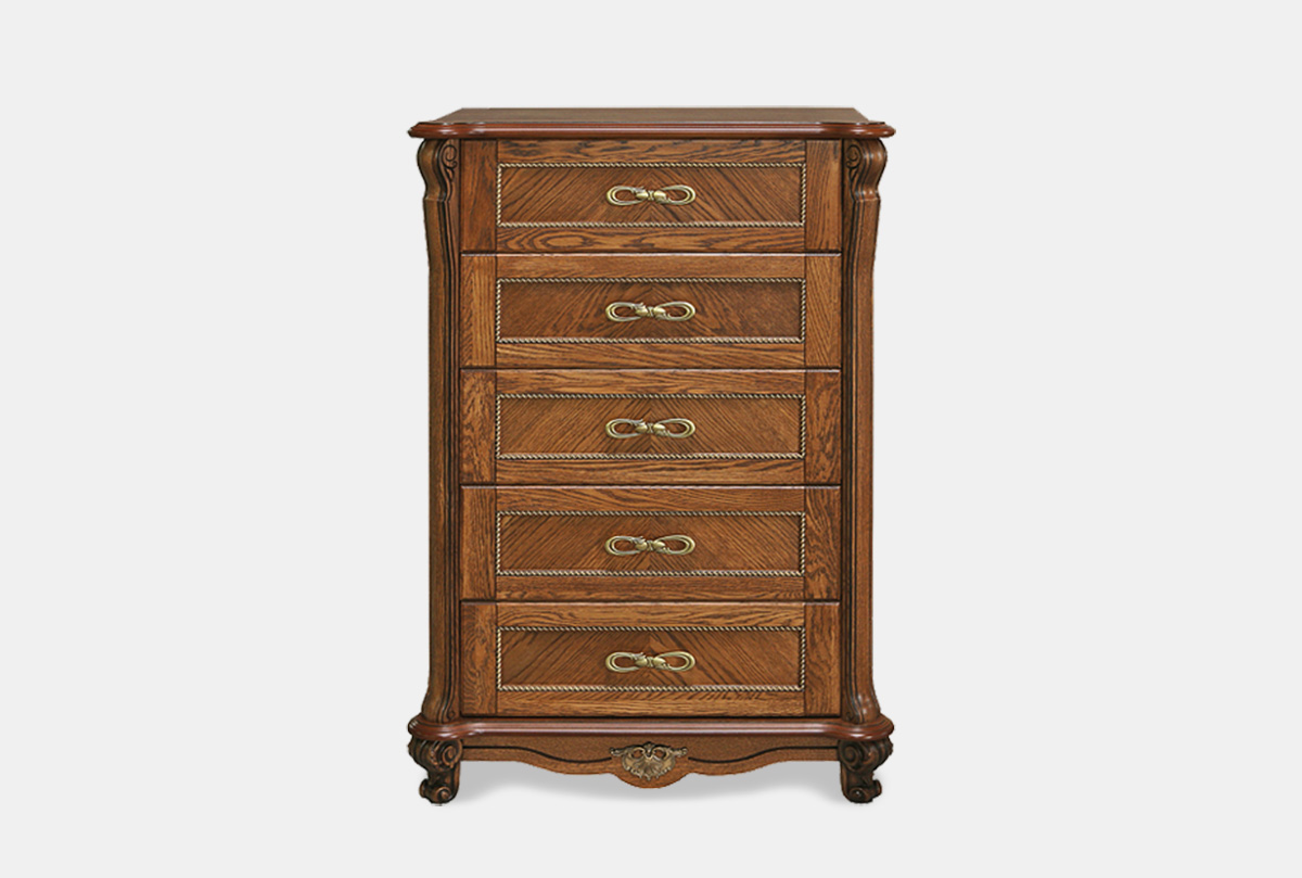 Высокий комод «Алези» (Alezi) отлично подойдет для квартир или загородных домов, меблированных в итальянском стиле. Он оснащен пятью вместительными выдвижными ящиками с качественными доводчиками, обеспечивающими бесшумное закрывание. Обилие декоративных элементов (инкрустации по технологии маркетри, оригинальная фурнитура, пилястры и фигурный цоколь) и благородные оттенки делают этот комод настоящим произведением искусства.