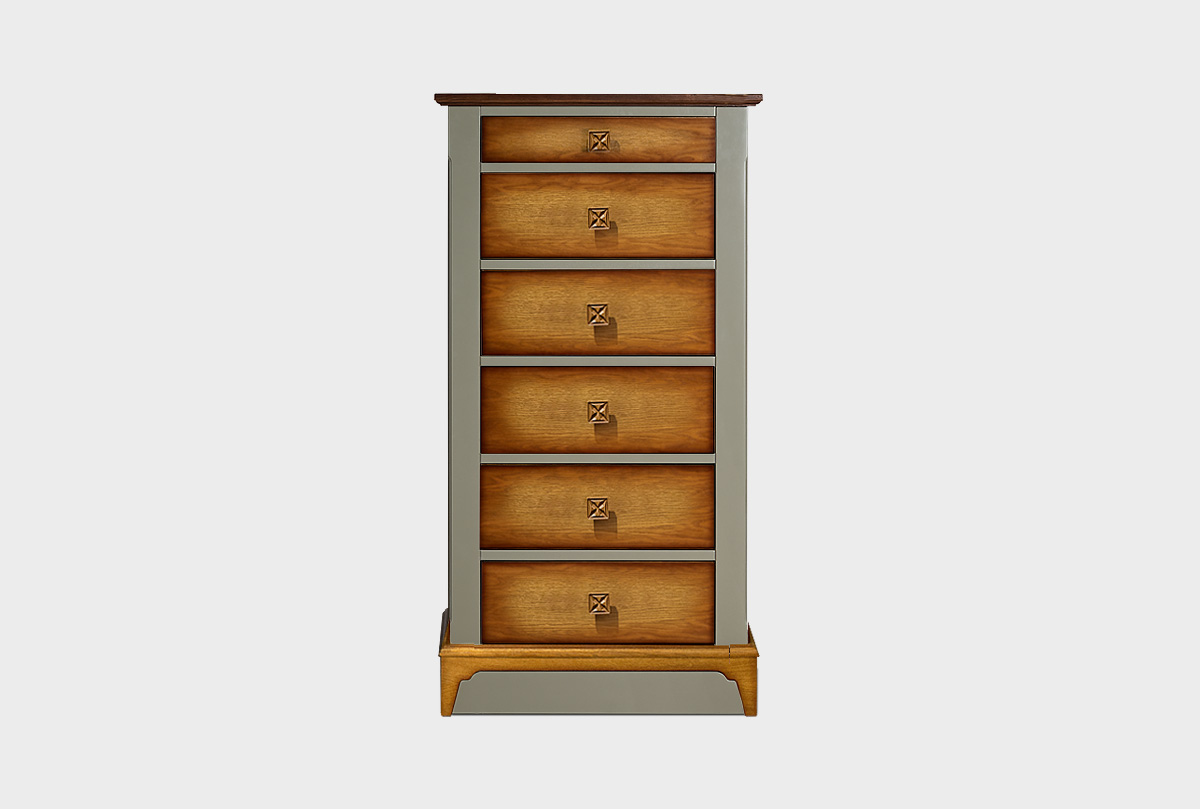Комод высокий «Бриансон» из массива и шпона дуба, в цвете "корсика+дуб" с шестью выдвижными ящиками. Мебель для спальни «Бриансон» из дуба в стиле Прованс. Размеры изделия: 753 х 1427 х 450 мм.