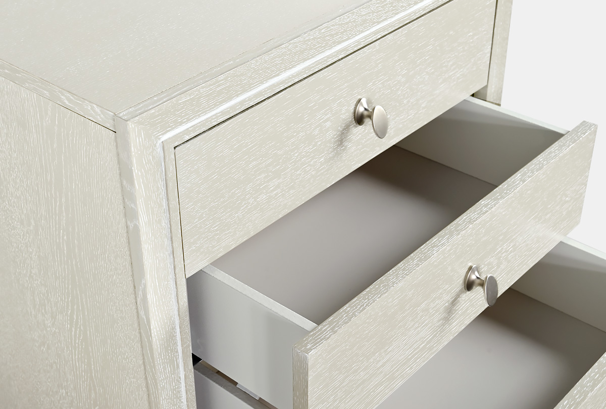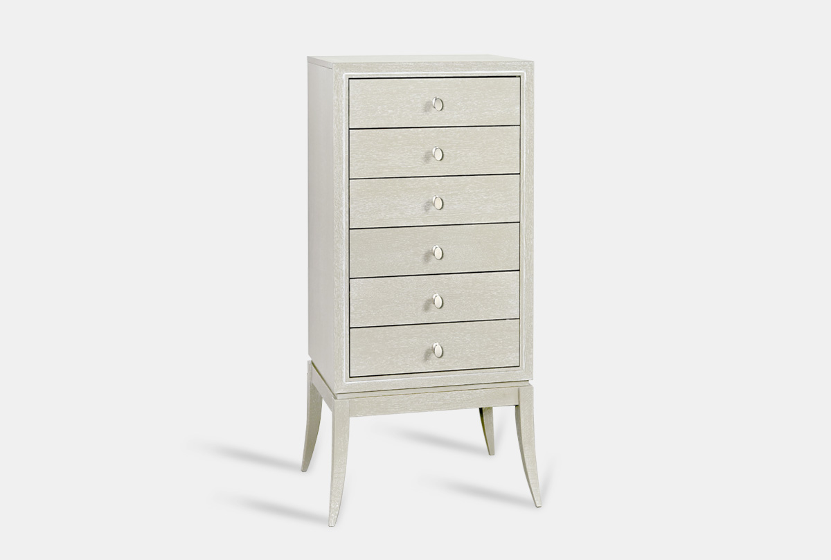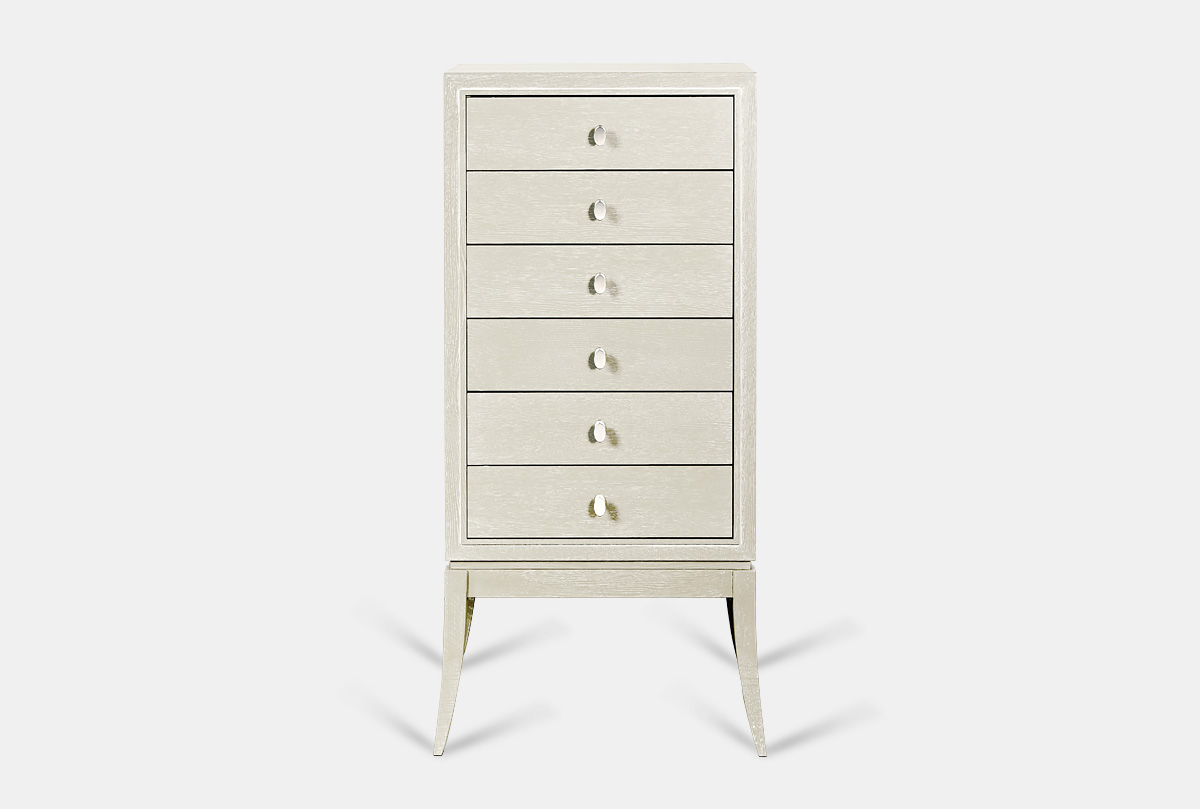 Уникальный высокий комод «Costa» сочетает в себе всё то, что так нравится любителям современной классики. Высокие гнутые ножки, благородный цвет «олива с белой патиной», минималистичная итальянская фурнитура – всё это нашло воплощение в высоком комоде «Costa». Комод не только идеален в дизайне, но и функционален. У него есть три глубоких выдвижных ящика, где можно удобно разместить постельное белье и одежду. Дно каждого ящика выстлано мягчайшим велюром для более бережного хранения любимых вещей.