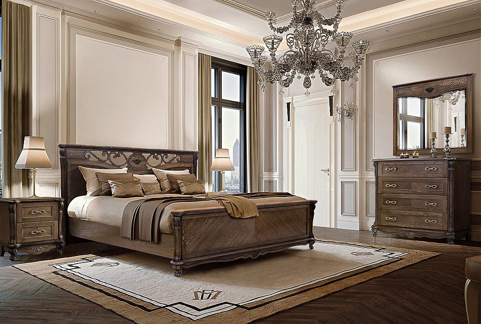 ✅ Инкрустация по технологии маркетри на филенках фасадов в цвете «античная бронза» и декоративная ажурная резьба из массива дуба на изголовье;