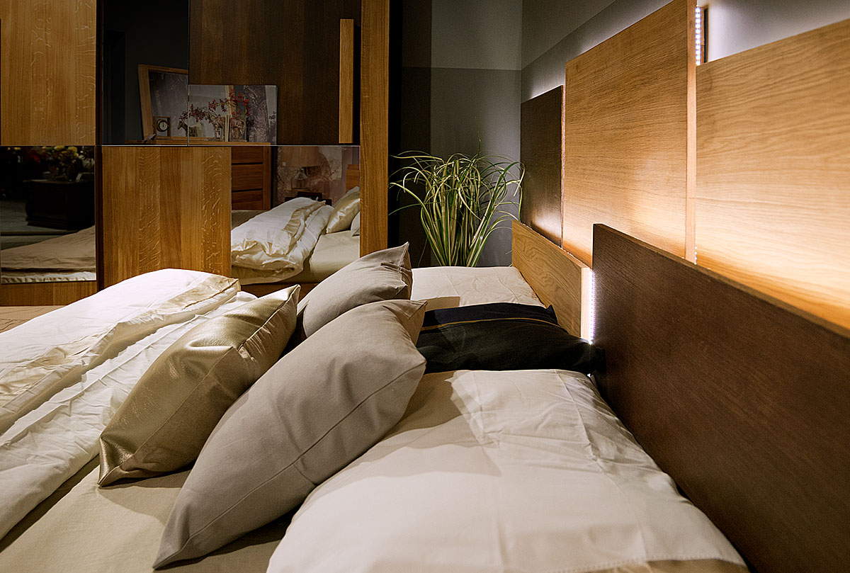 Кровать с подсветкой «Берген» 180 в цвете «бейц-масло, графит» из шпона дуба пропитана исключительно бейц-маслом, защищающим ее от влаги, УФ-излучения и различных загрязнений. Низкое изножье позволяет подойти к кровати с трех сторон, а невысокая спинка дает возможность поставить кровать в помещении с ограниченной высотой потолков, к примеру, в мансарде. Чистота линий и материалов должна поддерживаться чистотой в помещении: этого легко достичь, благодаря высоте ножек кровати, которая позволяет без трудностей проводить влажную уборку.