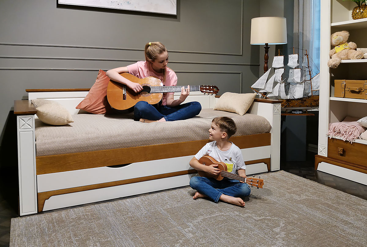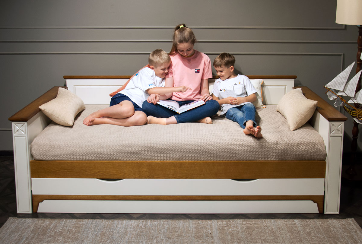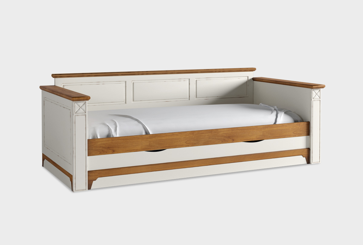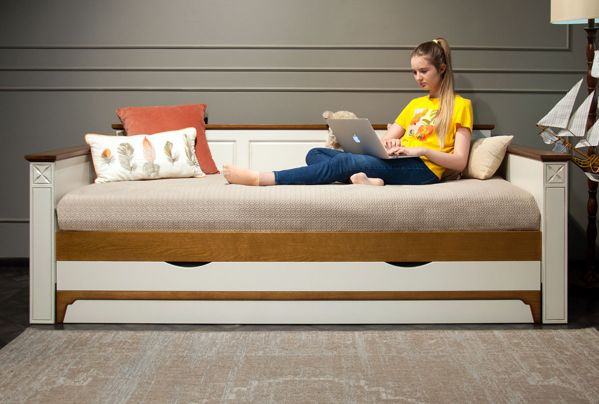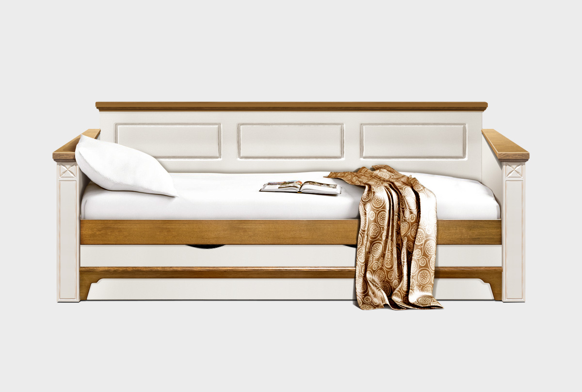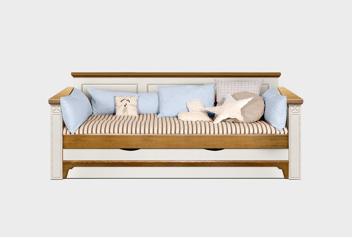 Кровать-диван «Бриансон» в цвете "жемчуг+дуб" прекрасно подходит для детских и гостевых комнат. Добротная и стильная кровать из массива и шпона дуба, станет незаменима в Вашем доме и сэкономит место. Днем – это компактный диван, а ночью 2 полноценных спальных места.