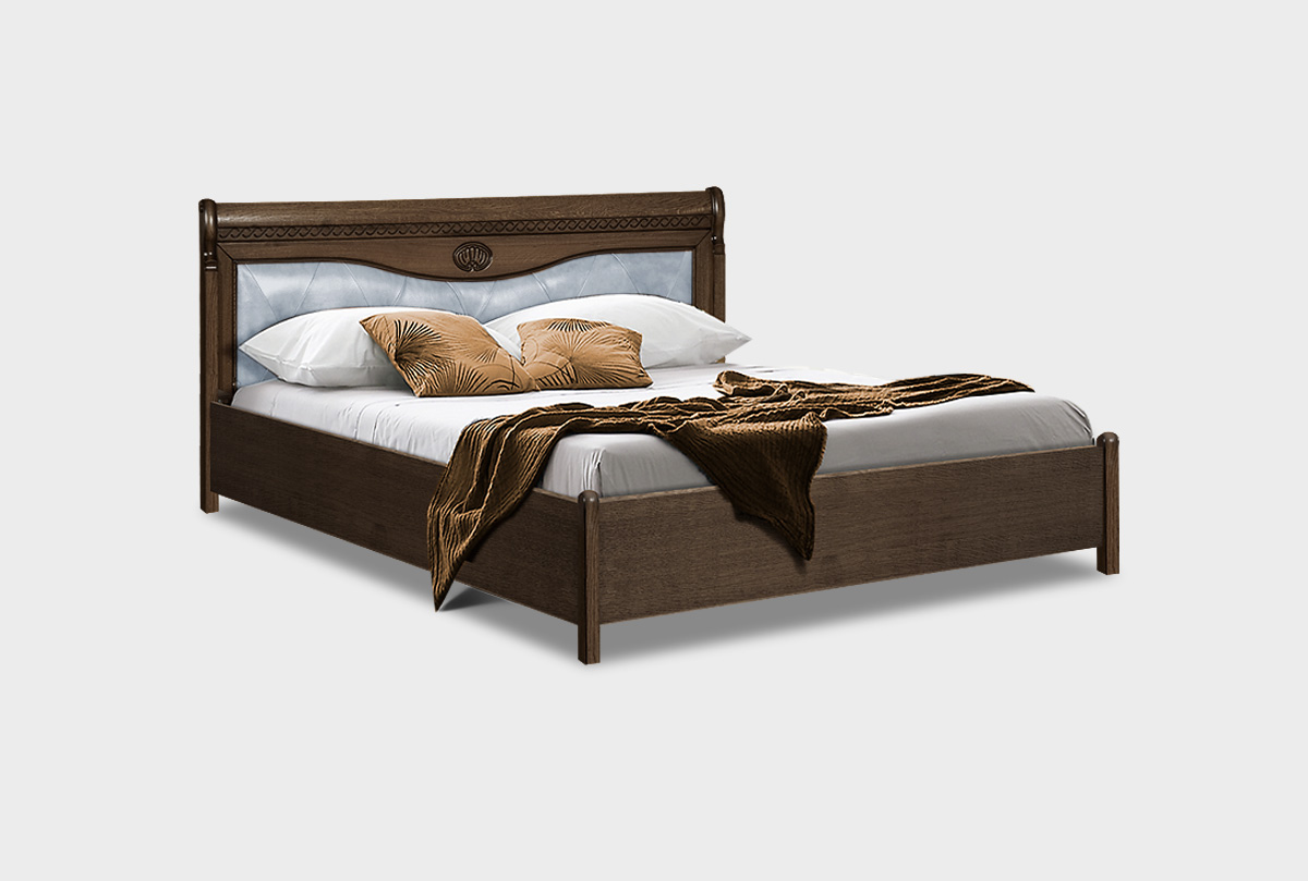 Двуспальная кровать «Лика» 140 в цвете «табак с тёмной патиной» с низким изножьем и мягким изголовьем, спальным местом 140х200 см., выполнена из древесины – массива и шпона дуба. Соединяя в себе классические каноны и современные технологии, кровать «Лика» (Lika) отличается декоративной резьбой, мягкой натуральной кожей 1079 в обивке изголовья и изысканными крашениями.