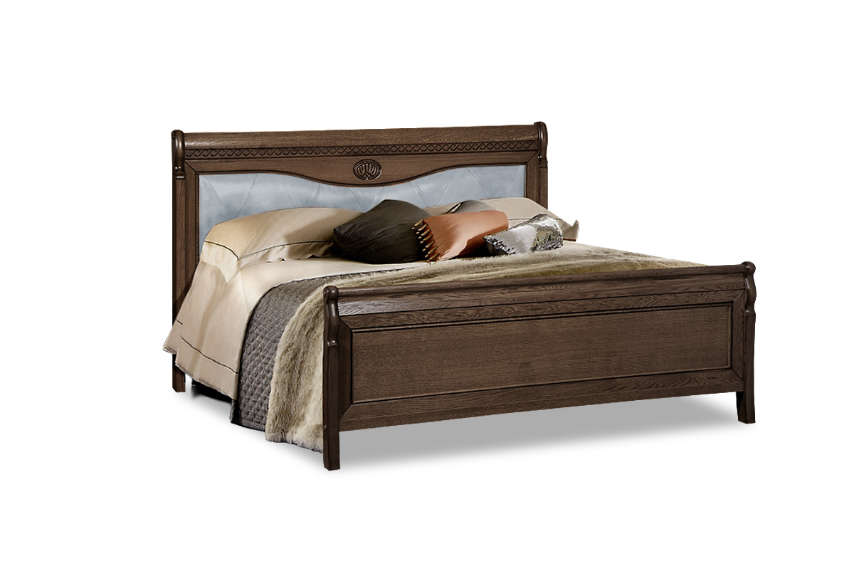 Кровать «Лика» 180 в цвете «табак с тёмной патиной» с высоким изножьем и мягким изголовьем из классической коллекции «Лика» выполнена из древесины – массива и шпона дуба. Соединяя в себе классические каноны и современные технологии, кровать «Лика» (Lika) отличается декоративной резьбой, мягкой натуральной кожей 1079 (гр. Кожи 1) в обивке изголовья и изысканным крашением.