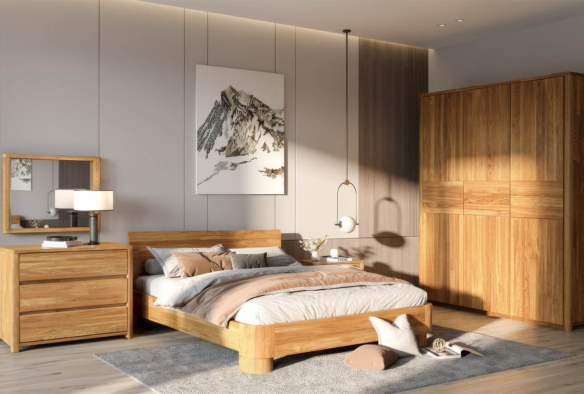 ✅ Несмотря на минималистичный дизайн, царги кровати изготавливаются из утолщенного массива, искусно подобранного по цвету и фактуре благородного дуба, что создает не только безупречный вид, но и долговечность.