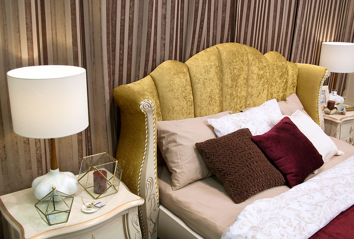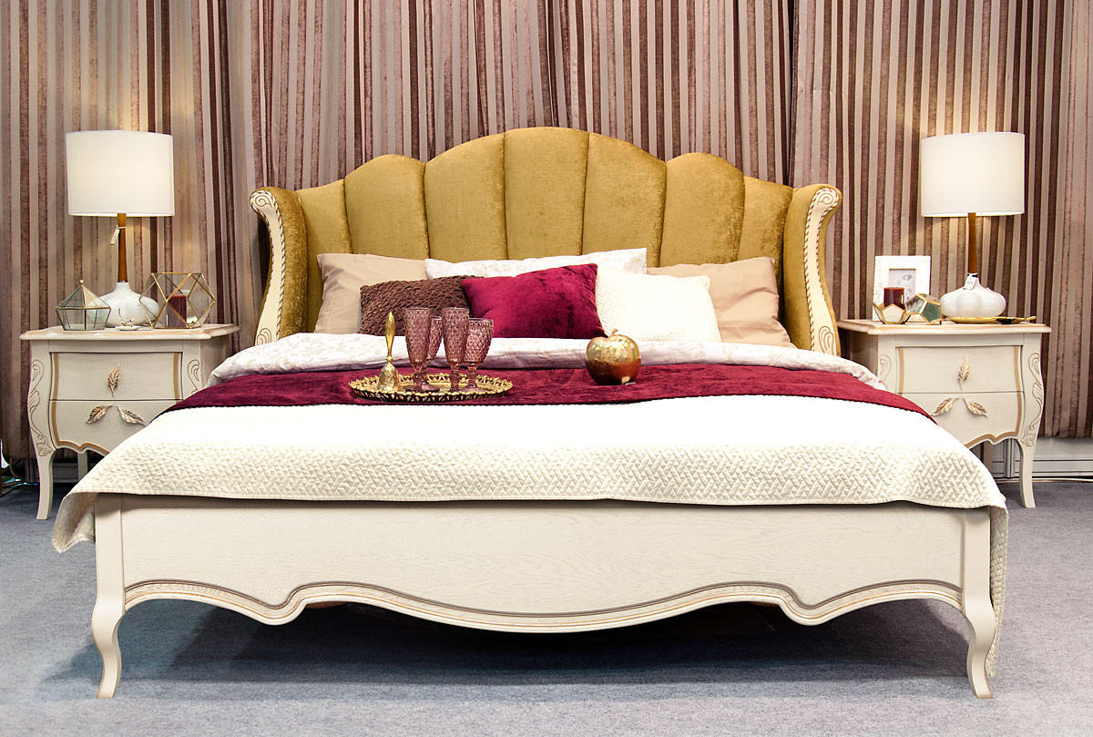 Кровать 180 с мягким изголовьем (деревянное основание) «Трио» (Trio) в цвете "белая эмаль с золотой патиной" с обивкой изголовья И-25.