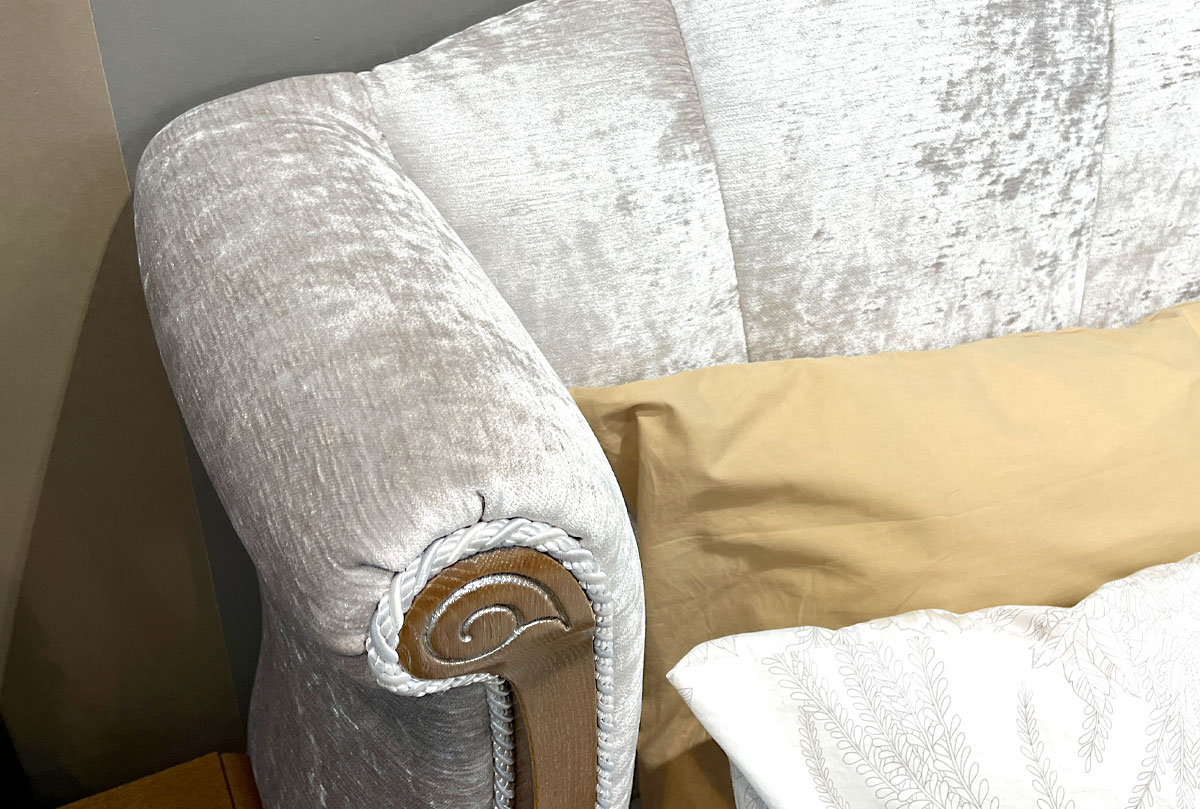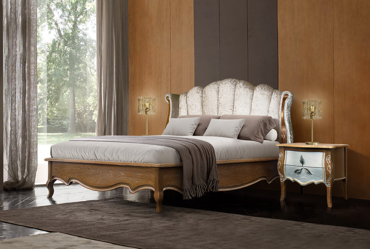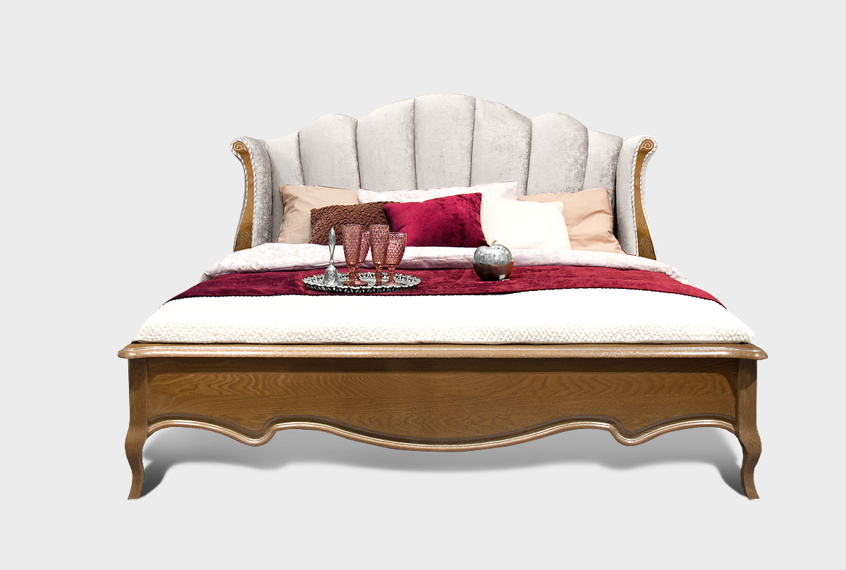Кровать 180 с мягким изголовьем (деревянное основание) «Трио» (Trio) в цвете "коньяк с серебряной патиной+серебро" с обивкой изголовья И-11.