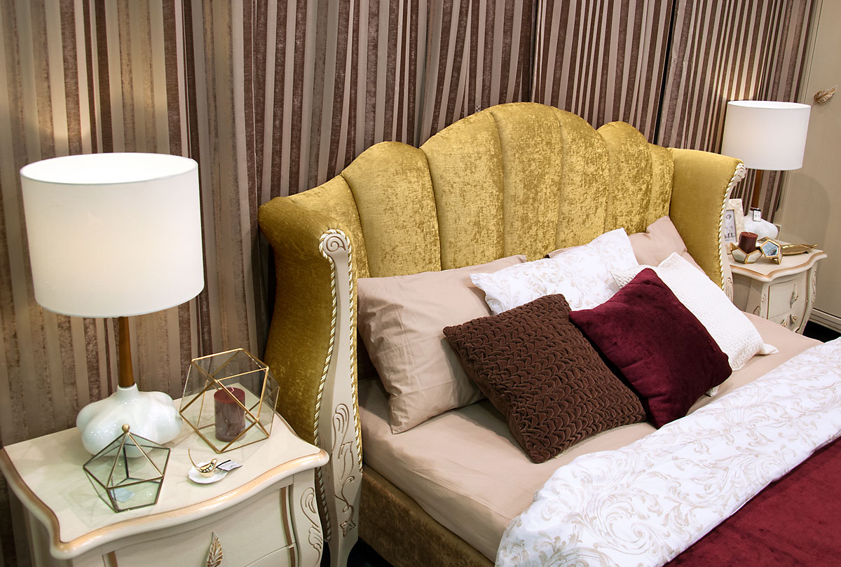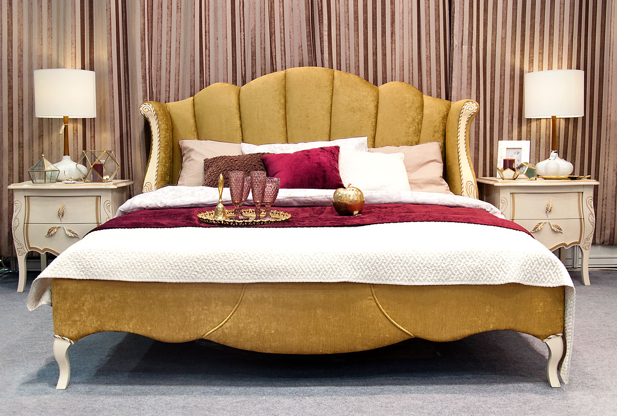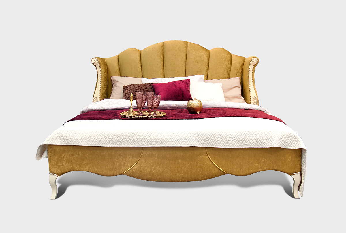 Кровать с цветом корпуса "белая эмаль с золотой патиной" с мягким изголовьем (основание обито тканью И-25) «Трио» (Trio). Спальное место 1800x2000 мм.