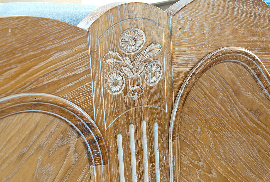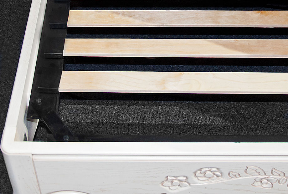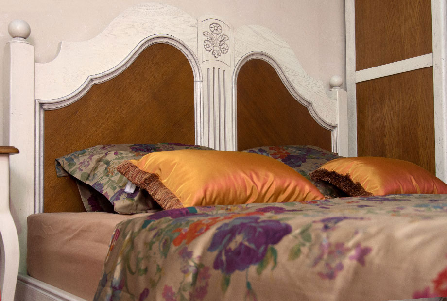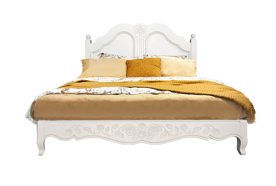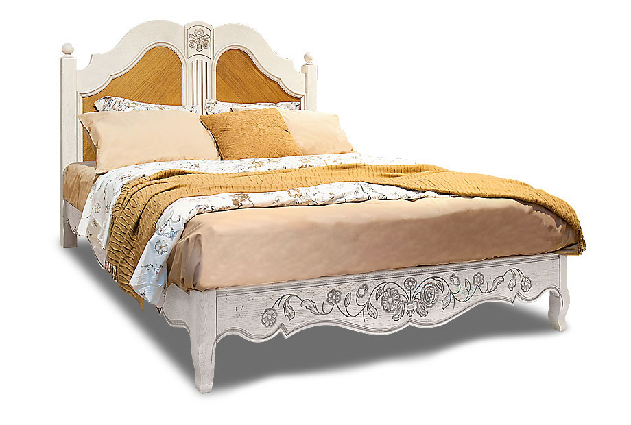 - Ручная резьба на изголовье и изножье кровати, фрезеровка по нижнему краю «юбки», фигурная рамка и филенка изголовья придают изделию утонченность и благородство.